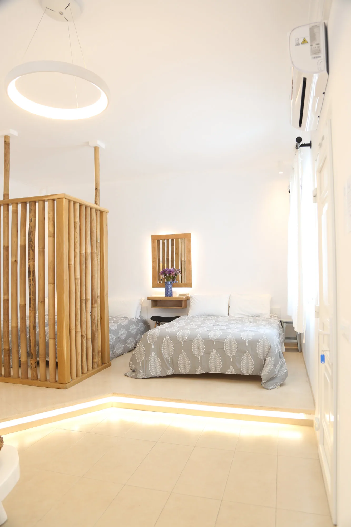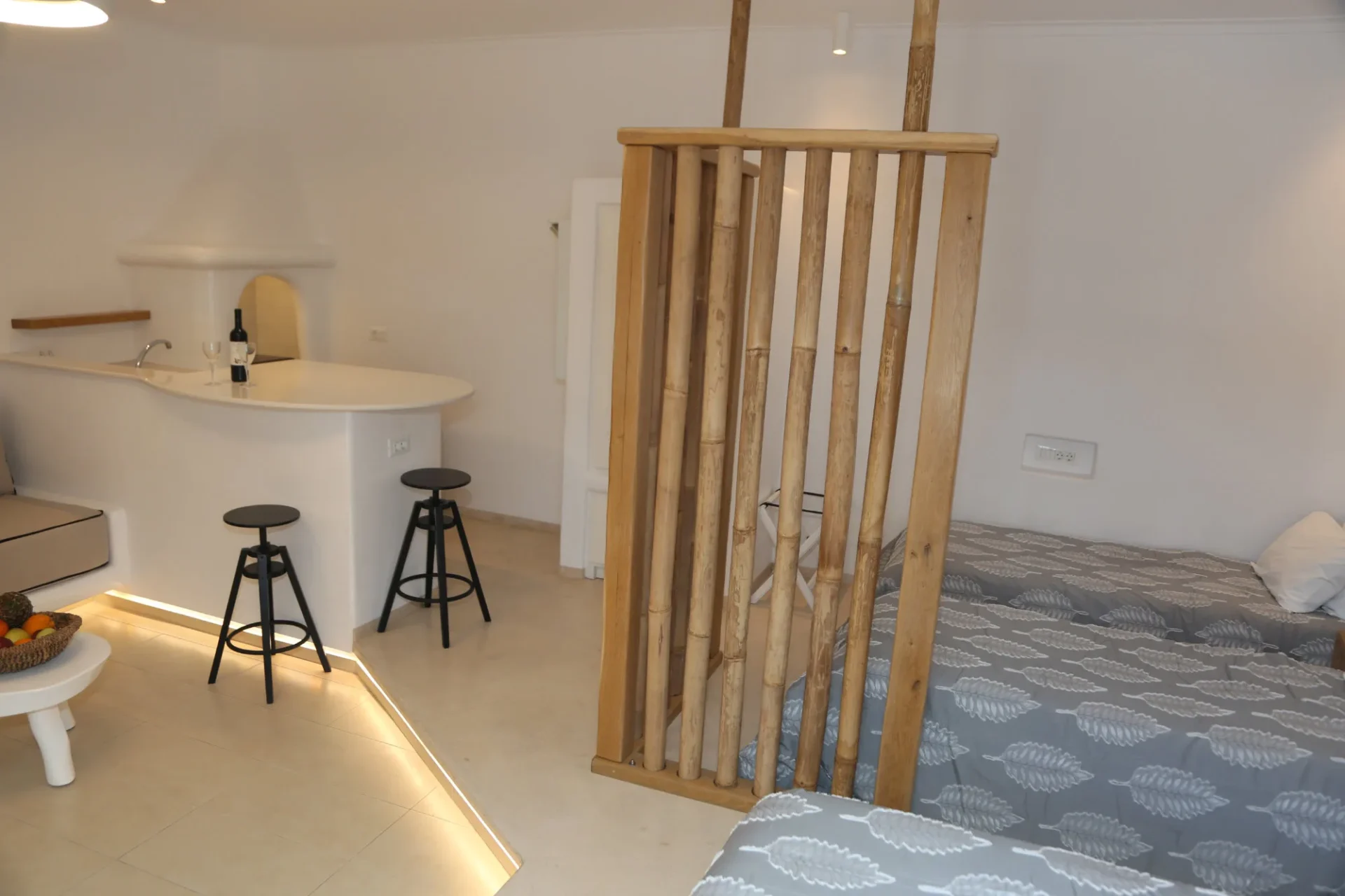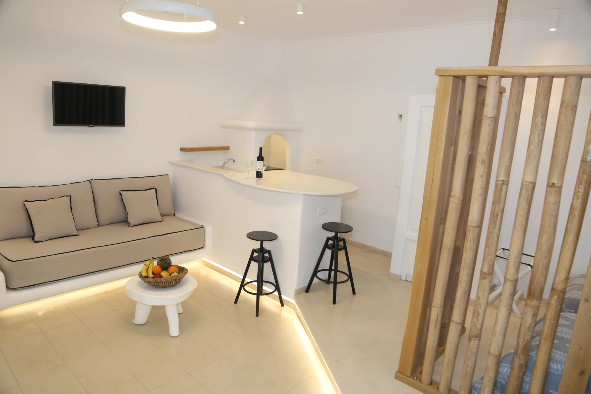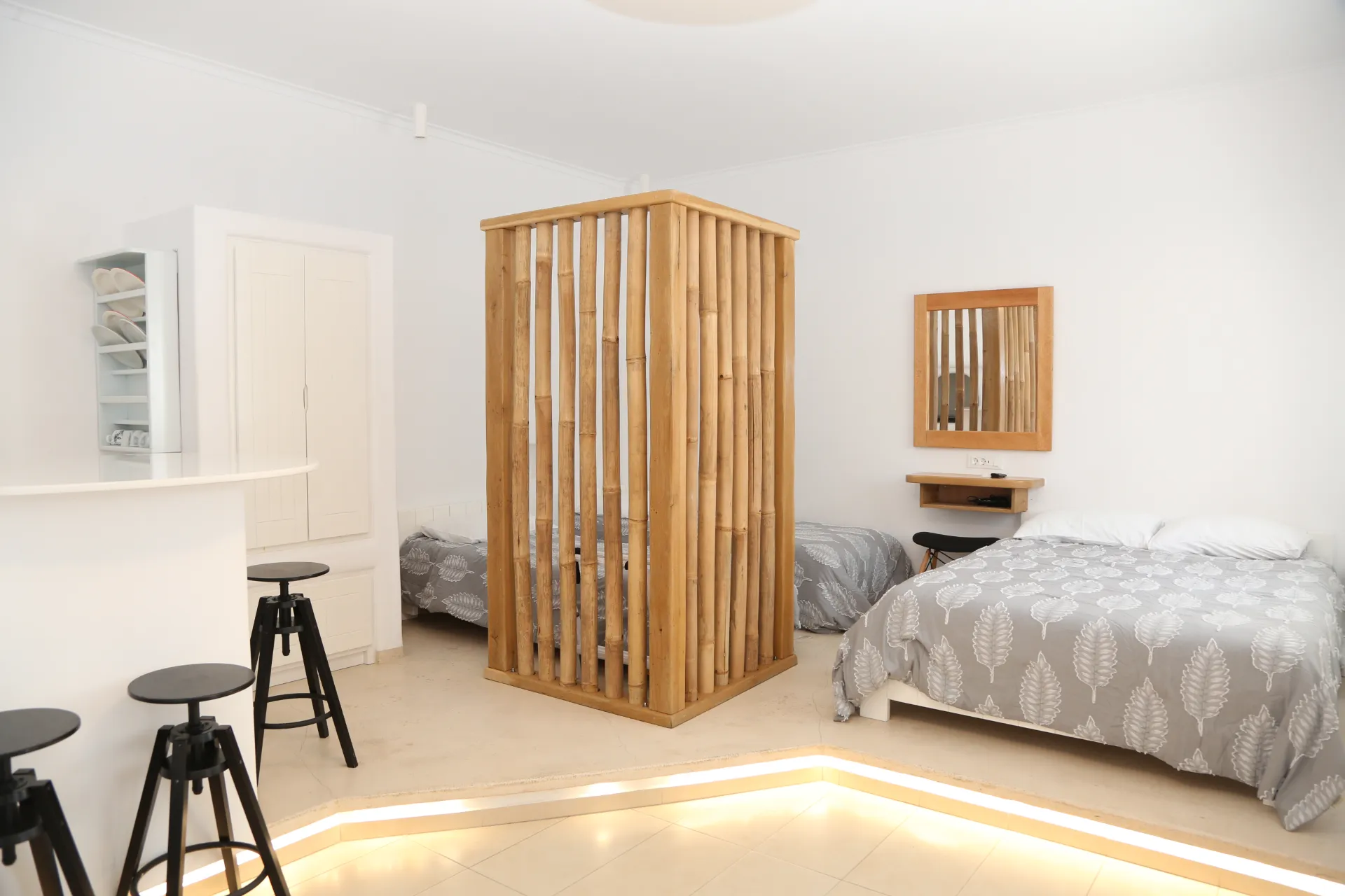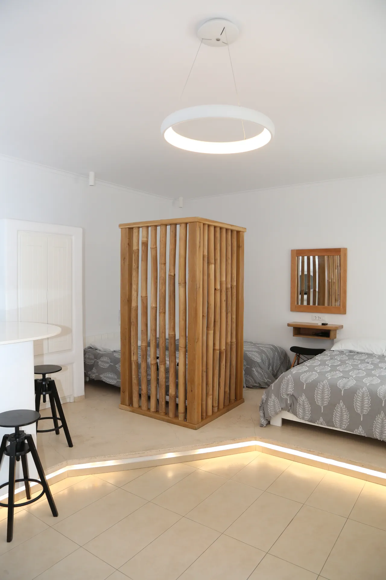 This single space studio (35 m²) represents a successful architectural fusion of traditional and modern elements. It features a double bed, two single beds, and a built-in sofa bed, as well as a fully equipped kitchen with utensils, a refrigerator, a coffee maker, a microwave, air conditioning, and a flat-screen smart TV. The most striking design element is the bathroom, with its distinctive dome, tiered flooring, separate wooden fixtures, and concealed lighting. The outdoor terrace, with its built-in benches and garden views, is ideal for breakfast, lunch, or dinner. Enjoy a wonderful stay. Experience traditional hospitality at Anais's. The Deluxe quintuple studio can accommodate up to 5 people.