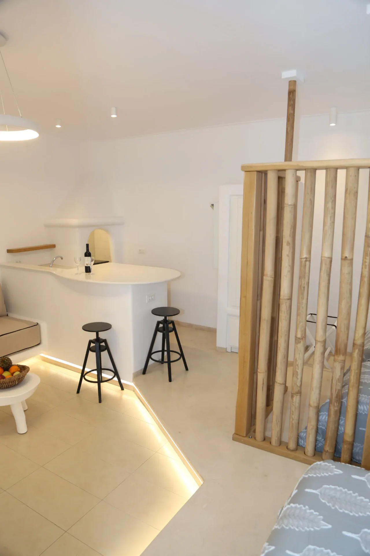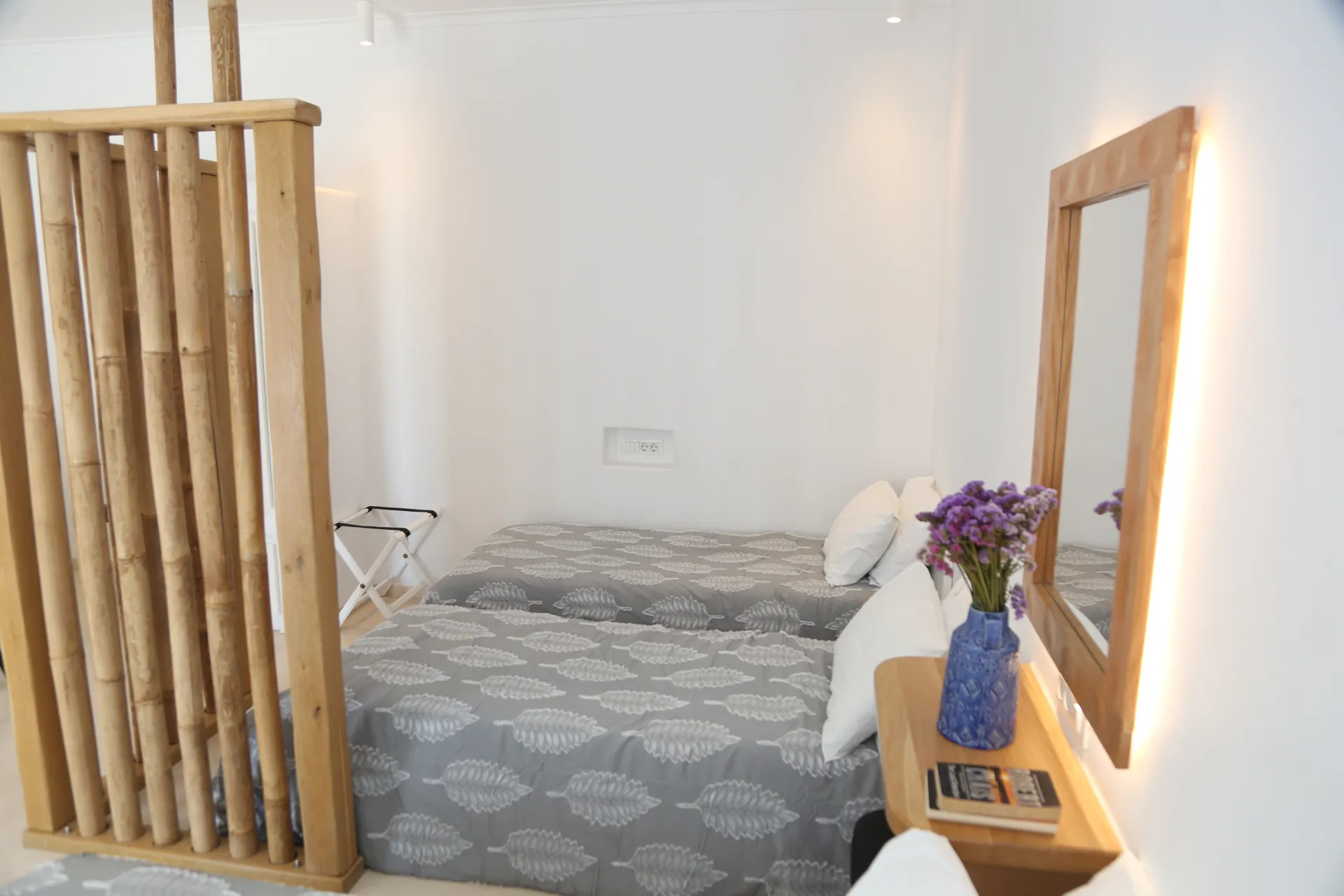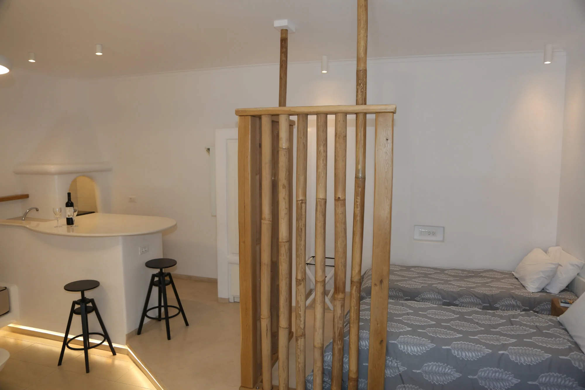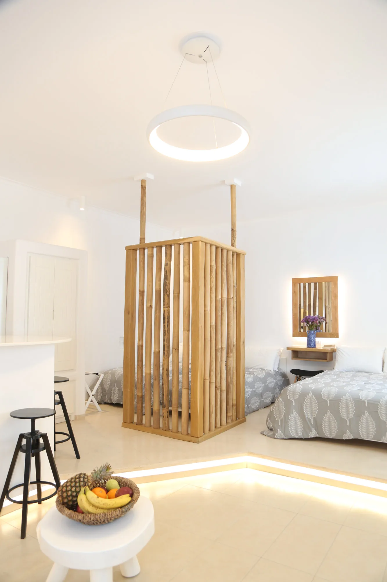 This single space studio (35 m²) represents a successful architectural fusion of traditional and modern elements. It features a double bed, two single beds, and a built-in sofa bed, as well as a fully equipped kitchen with utensils, a refrigerator, a coffee maker, a microwave, air conditioning, and a flat-screen smart TV. The most striking design element is the bathroom, with its distinctive dome, tiered flooring, separate wooden fixtures, and concealed lighting. The outdoor terrace, with its built-in benches and garden views, is ideal for breakfast, lunch, or dinner. Enjoy a wonderful stay. Experience traditional hospitality at Anais's. The Deluxe quintuple studio can accommodate up to 5 people.