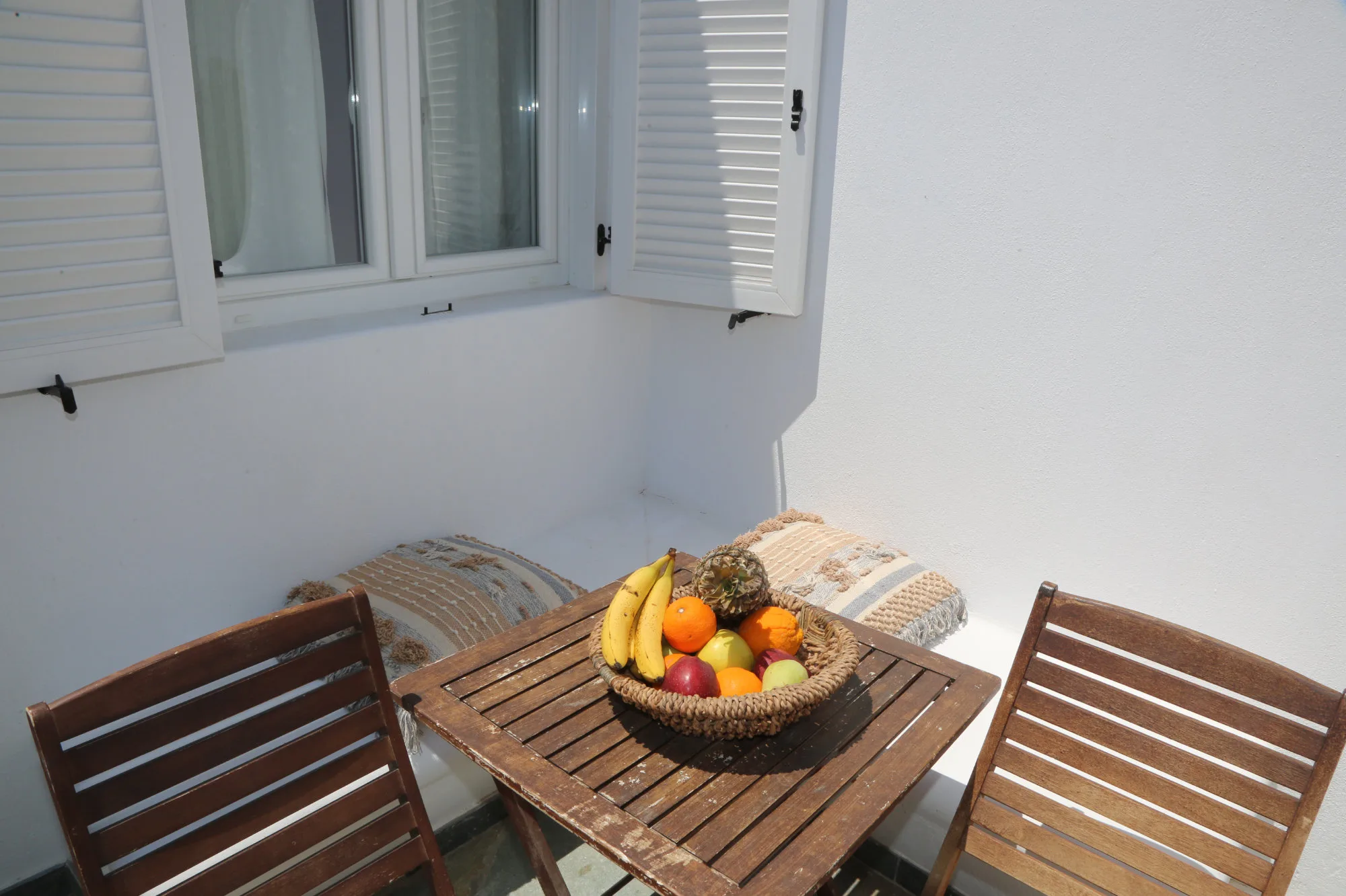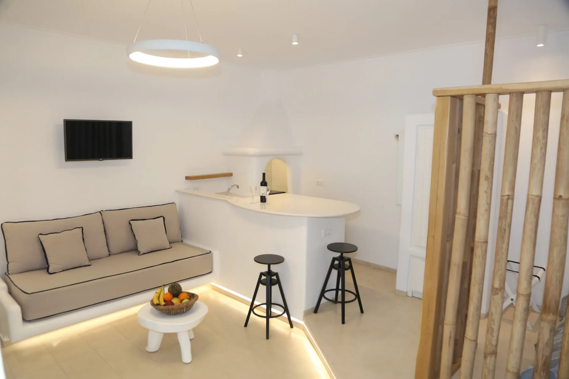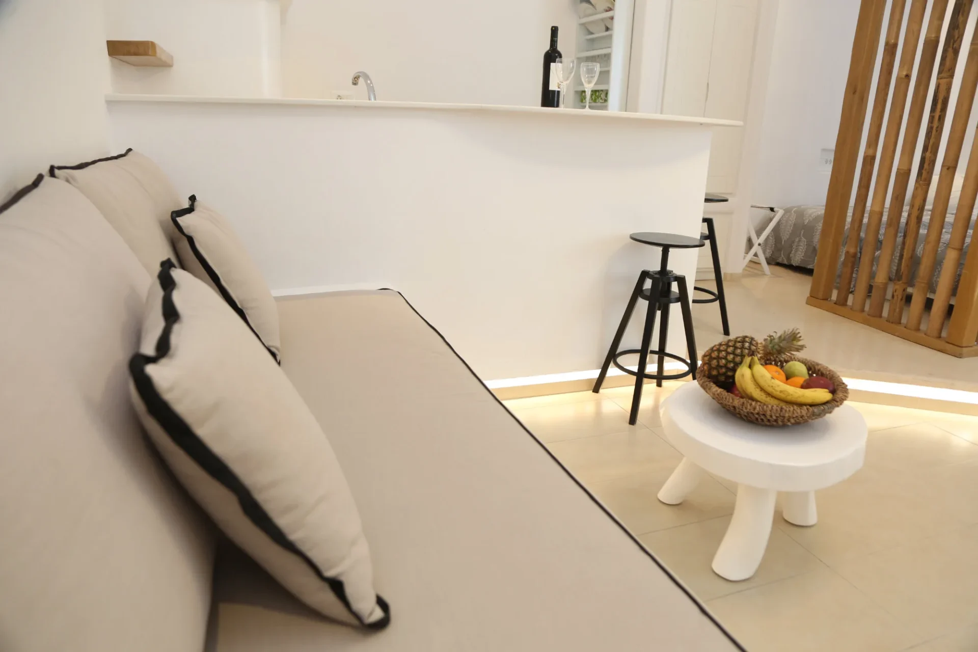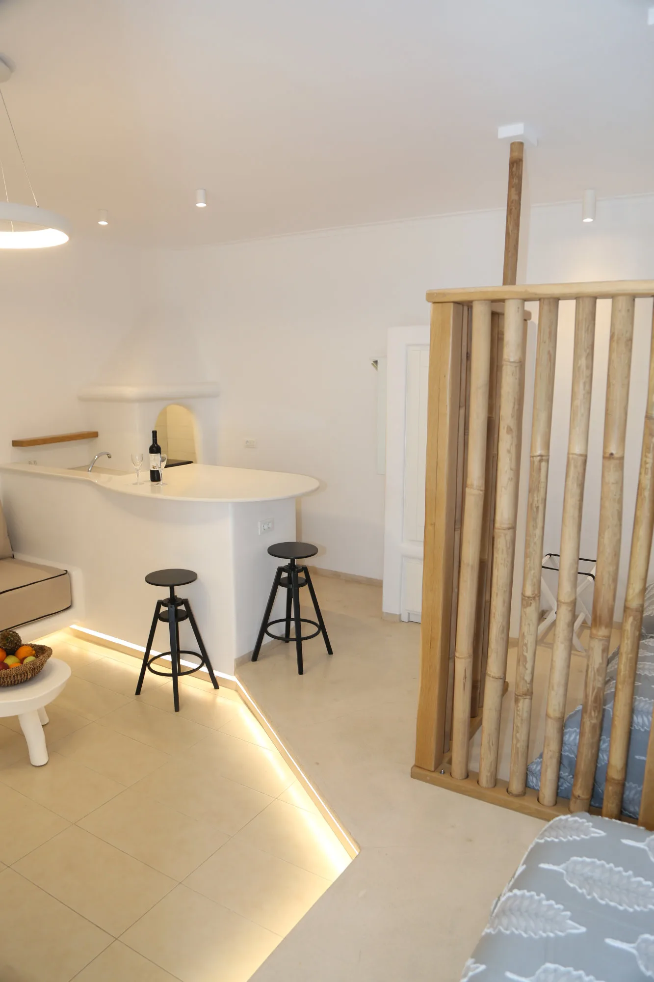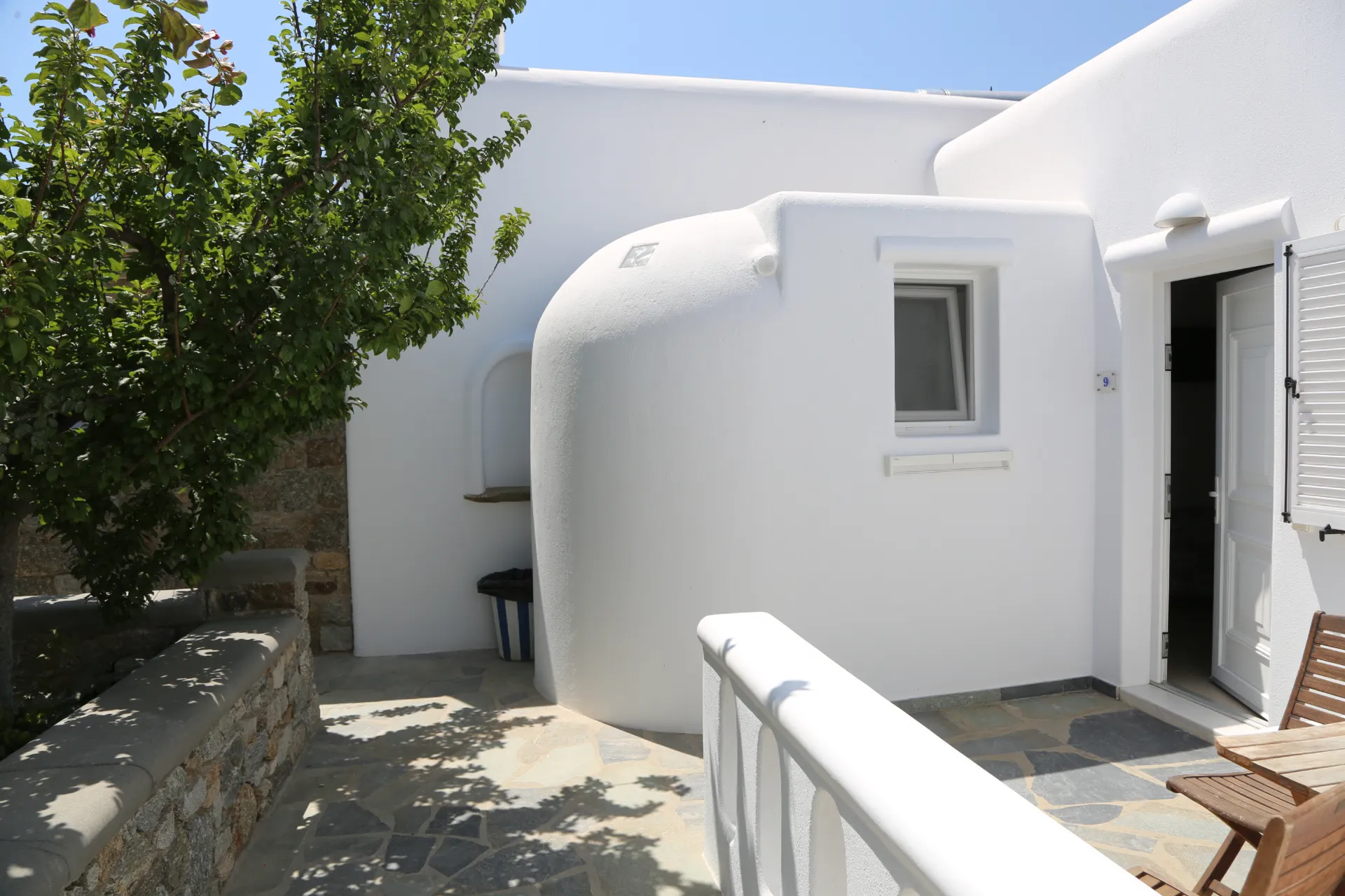 This single space studio (35 m²) represents a successful architectural fusion of traditional and modern elements. It features a double bed, two single beds, and a built-in sofa bed, as well as a fully equipped kitchen with utensils, a refrigerator, a coffee maker, a microwave, air conditioning, and a flat-screen smart TV. The most striking design element is the bathroom, with its distinctive dome, tiered flooring, separate wooden fixtures, and concealed lighting. The outdoor terrace, with its built-in benches and garden views, is ideal for breakfast, lunch, or dinner. Enjoy a wonderful stay. Experience traditional hospitality at Anais's. The Deluxe quintuple studio can accommodate up to 5 people.