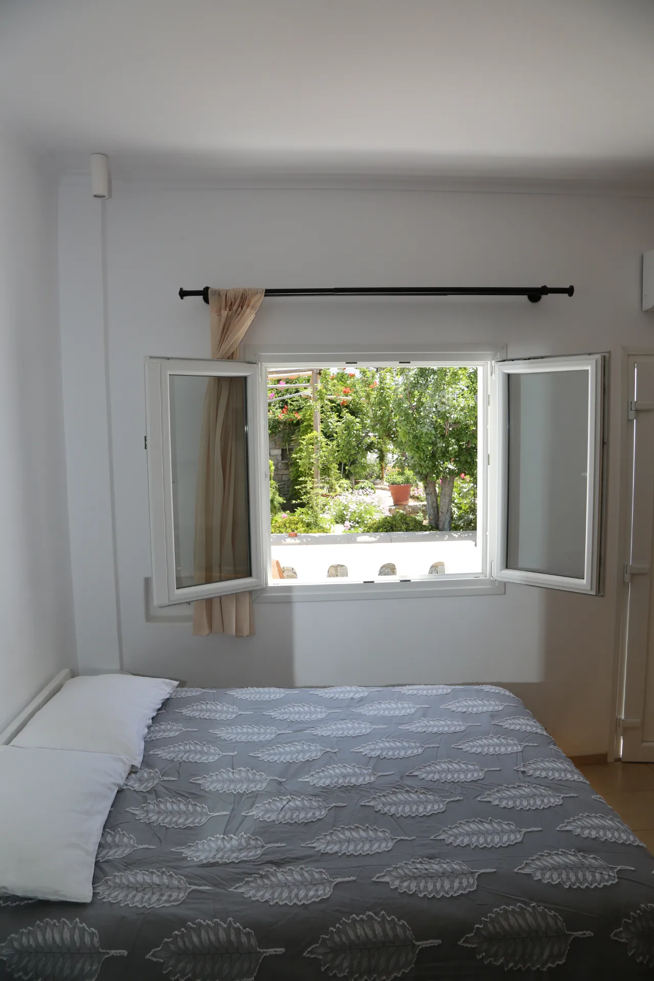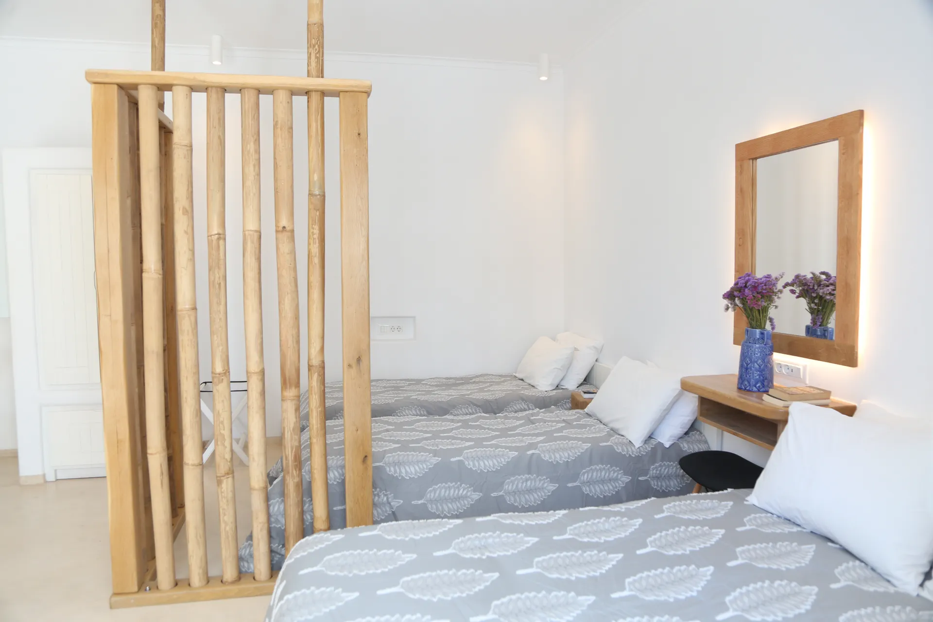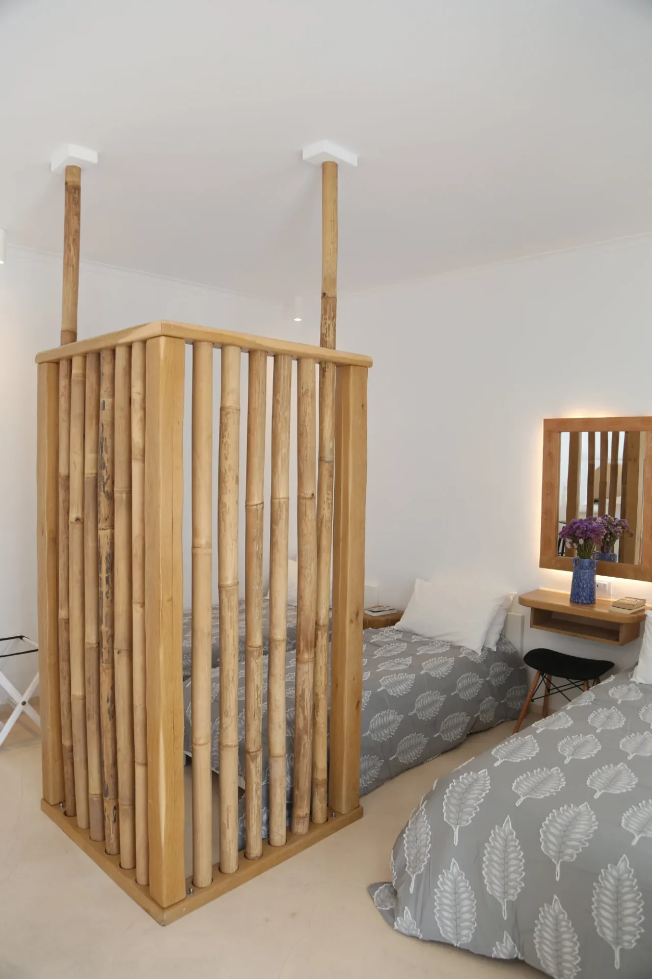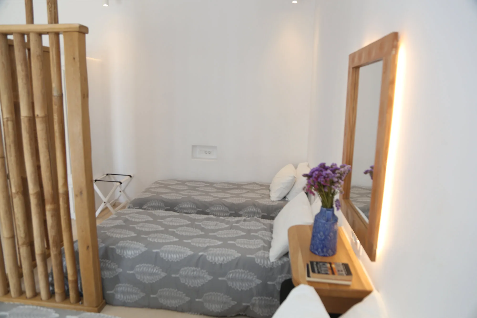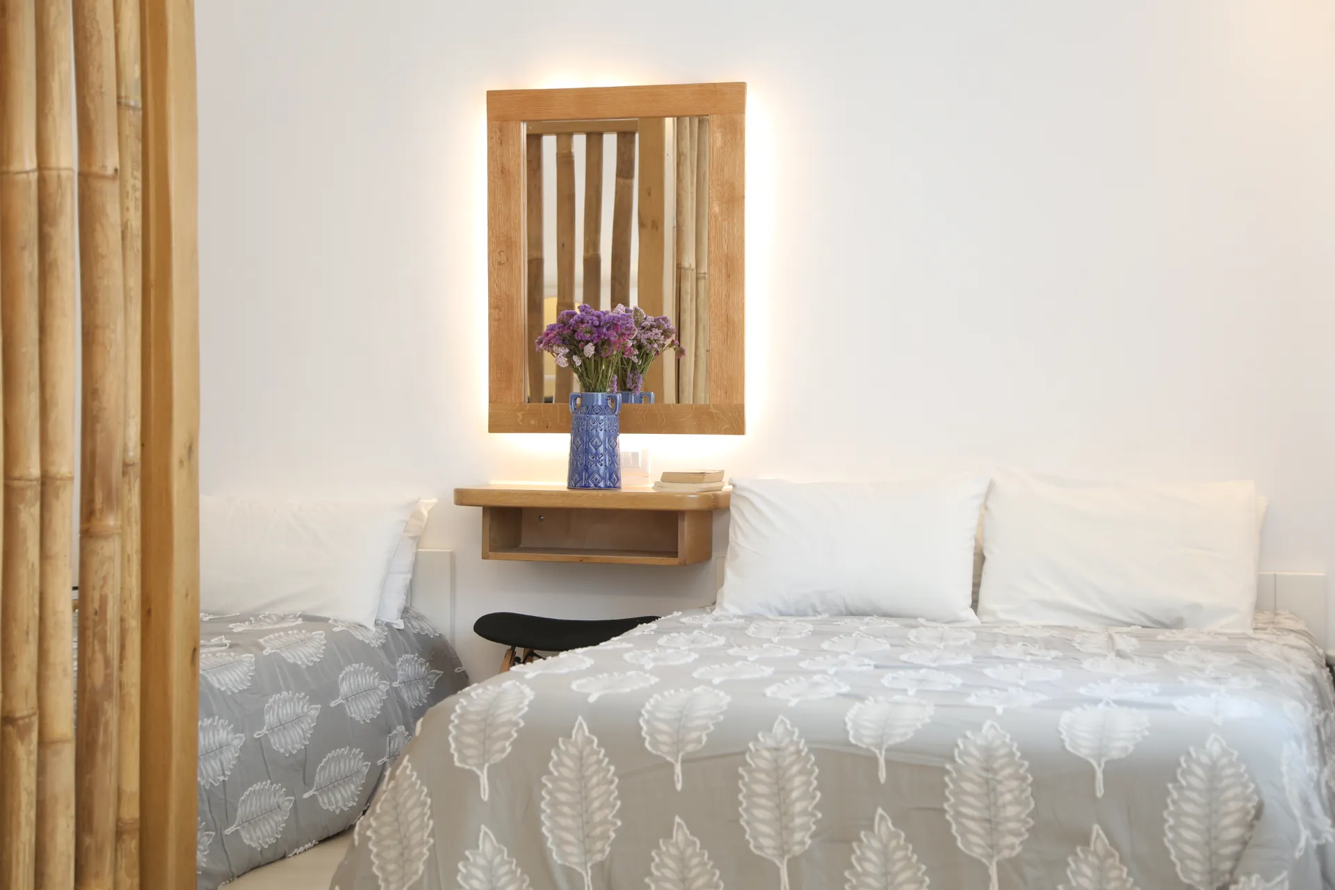 This single space studio (35 m²) represents a successful architectural fusion of traditional and modern elements. It features a double bed, two single beds, and a built-in sofa bed, as well as a fully equipped kitchen with utensils, a refrigerator, a coffee maker, a microwave, air conditioning, and a flat-screen smart TV. The most striking design element is the bathroom, with its distinctive dome, tiered flooring, separate wooden fixtures, and concealed lighting. The outdoor terrace, with its built-in benches and garden views, is ideal for breakfast, lunch, or dinner. Enjoy a wonderful stay. Experience traditional hospitality at Anais's. The Deluxe quintuple studio can accommodate up to 5 people.