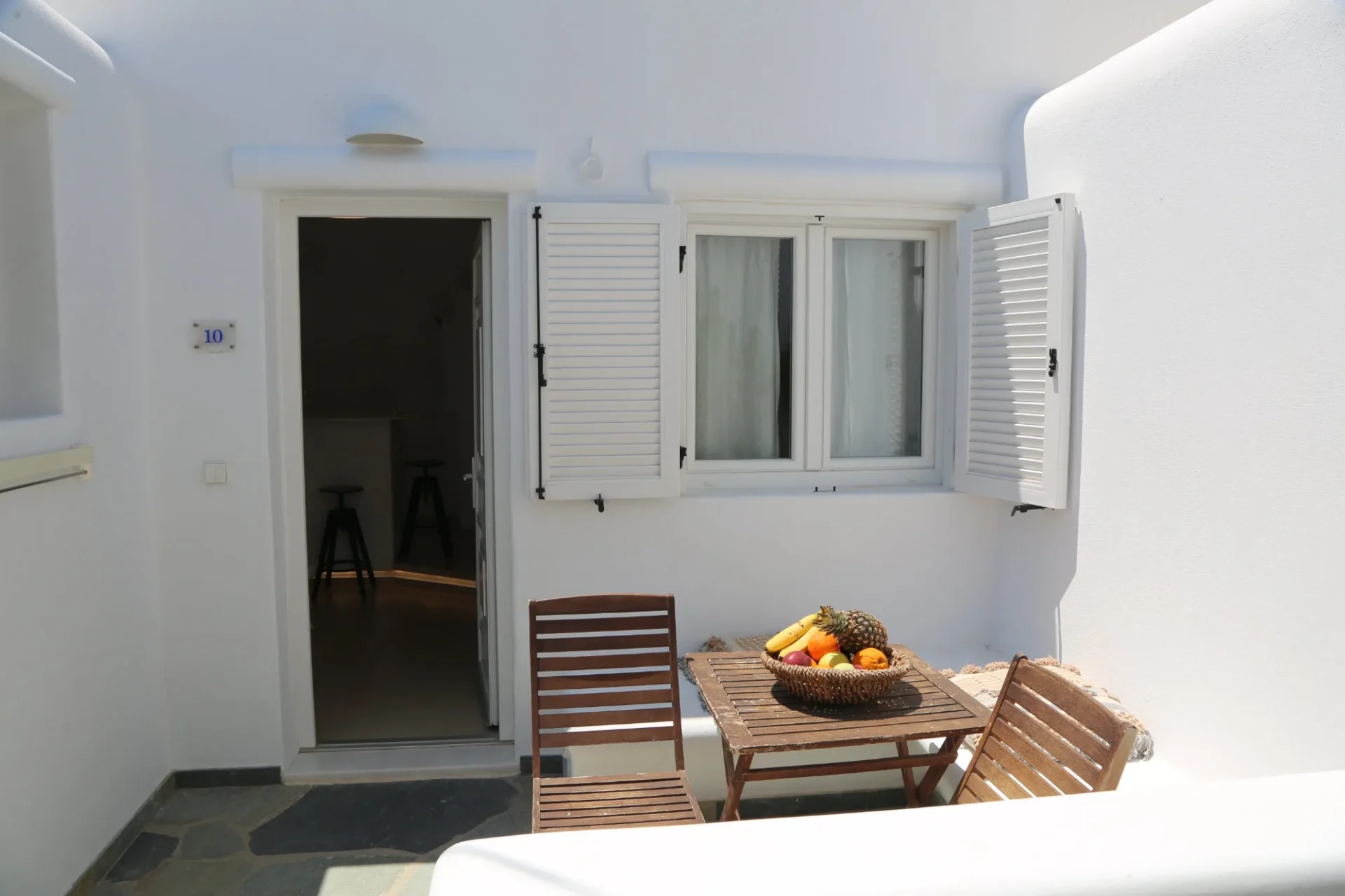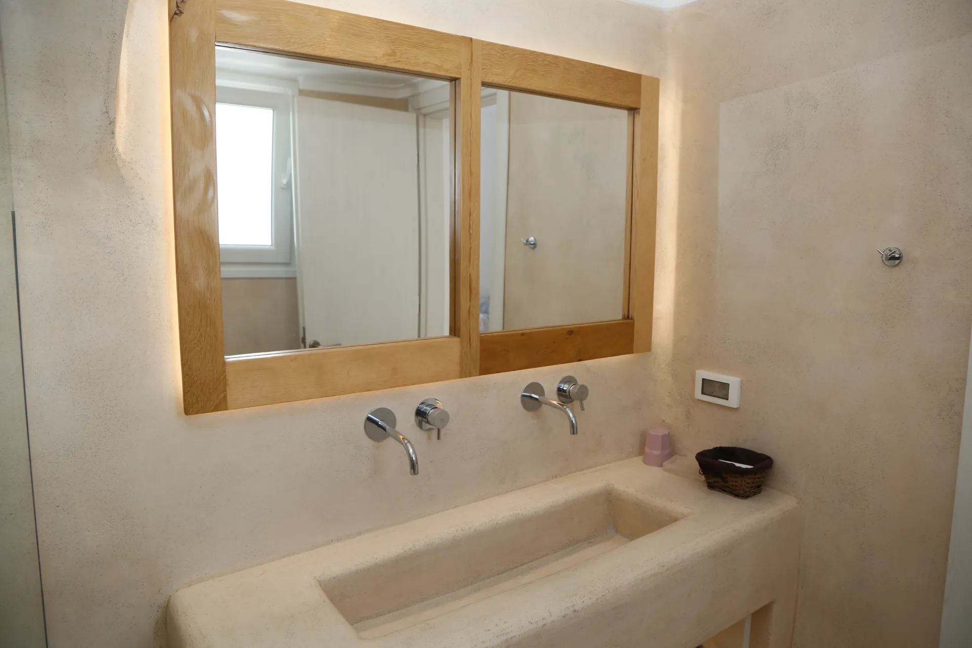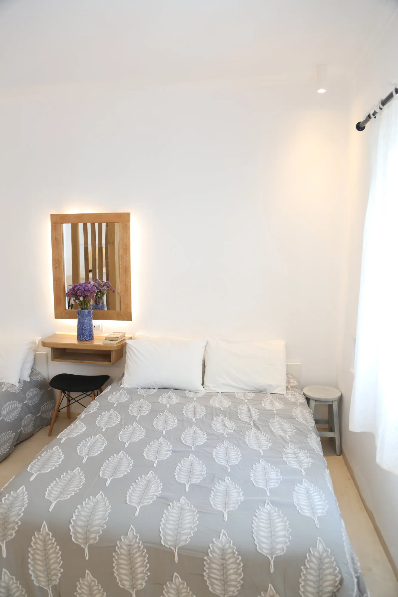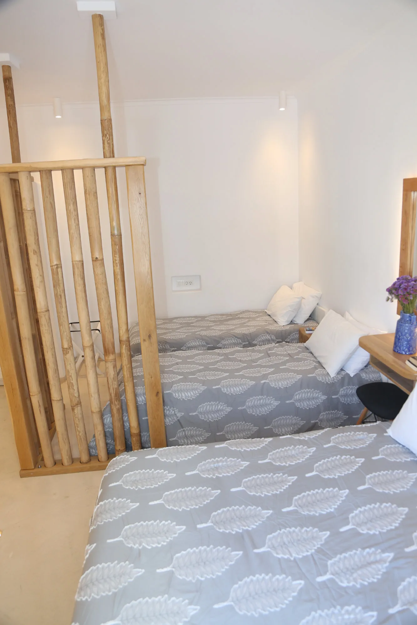 This single space studio (35 m²) represents a successful architectural fusion of traditional and modern elements. It features a double bed, two single beds, and a built-in sofa bed, as well as a fully equipped kitchen with utensils, a refrigerator, a coffee maker, a microwave, air conditioning, and a flat-screen smart TV. The most striking design element is the bathroom, with its distinctive dome, tiered flooring, separate wooden fixtures, and concealed lighting. The outdoor terrace, with its built-in benches and garden views, is ideal for breakfast, lunch, or dinner. Enjoy a wonderful stay. Experience traditional hospitality at Anais's. The Deluxe quintuple studio can accommodate up to 5 people.