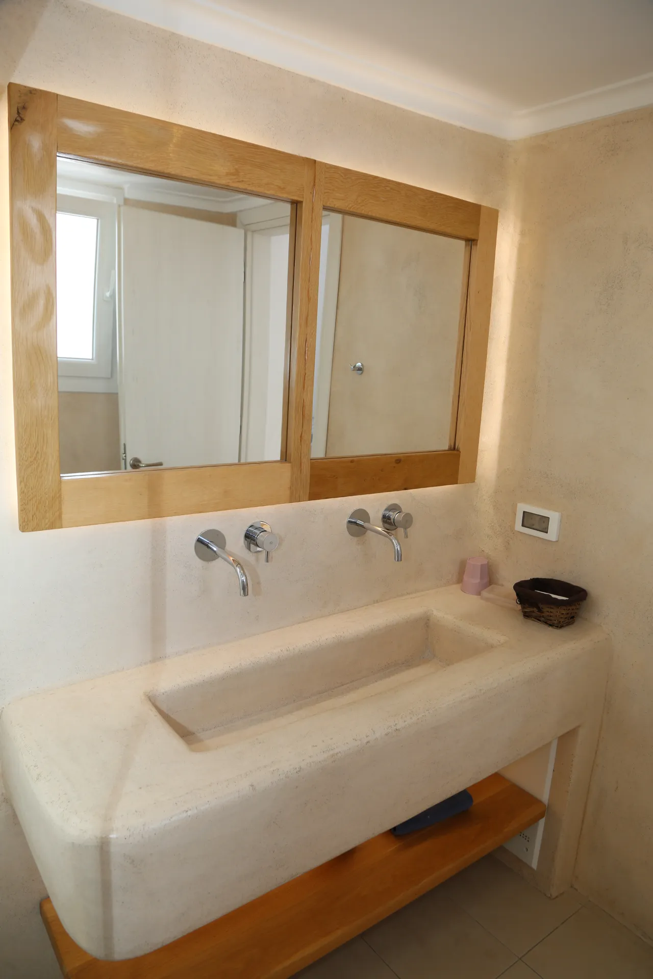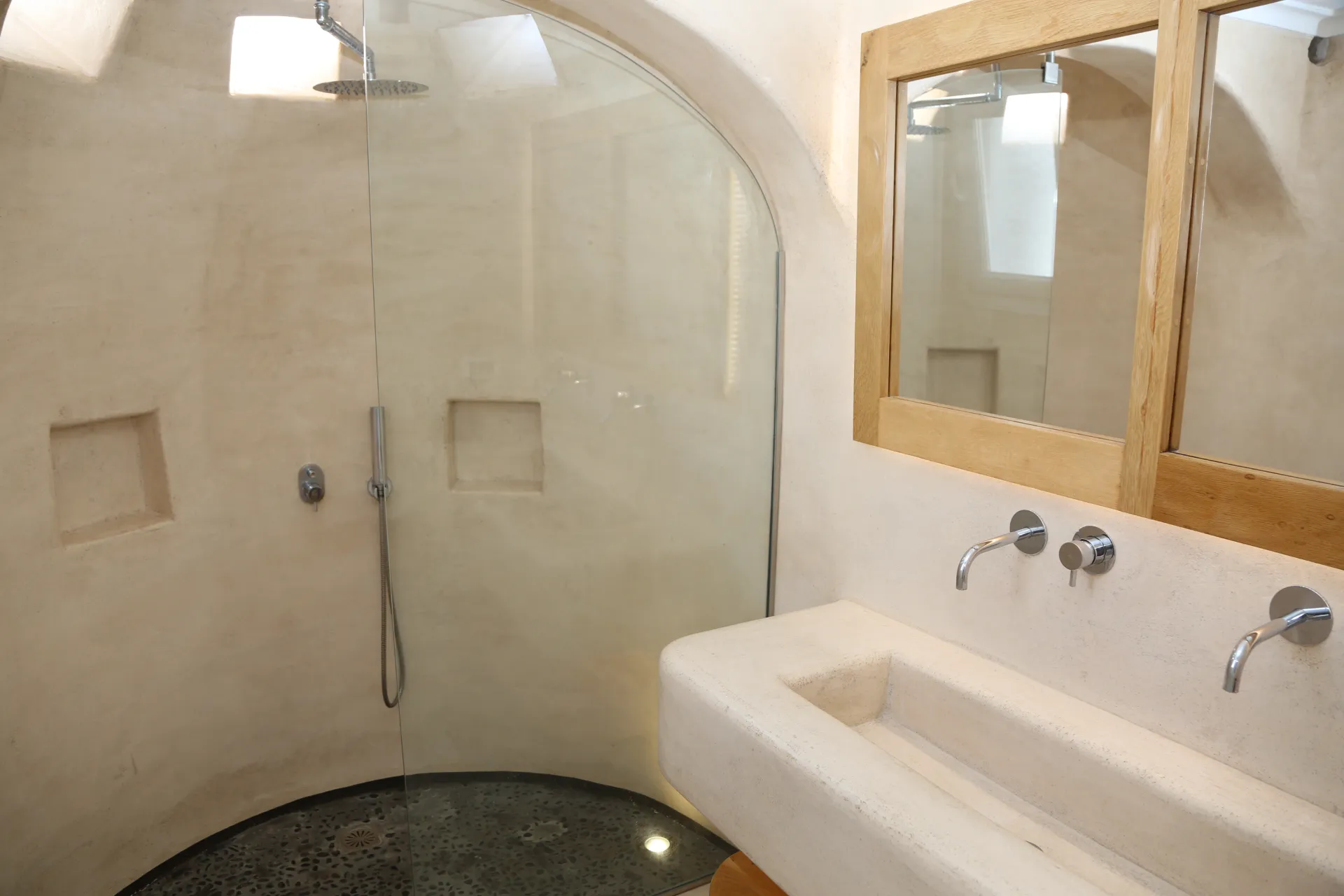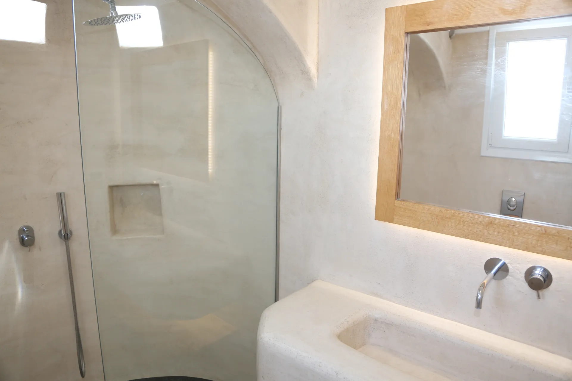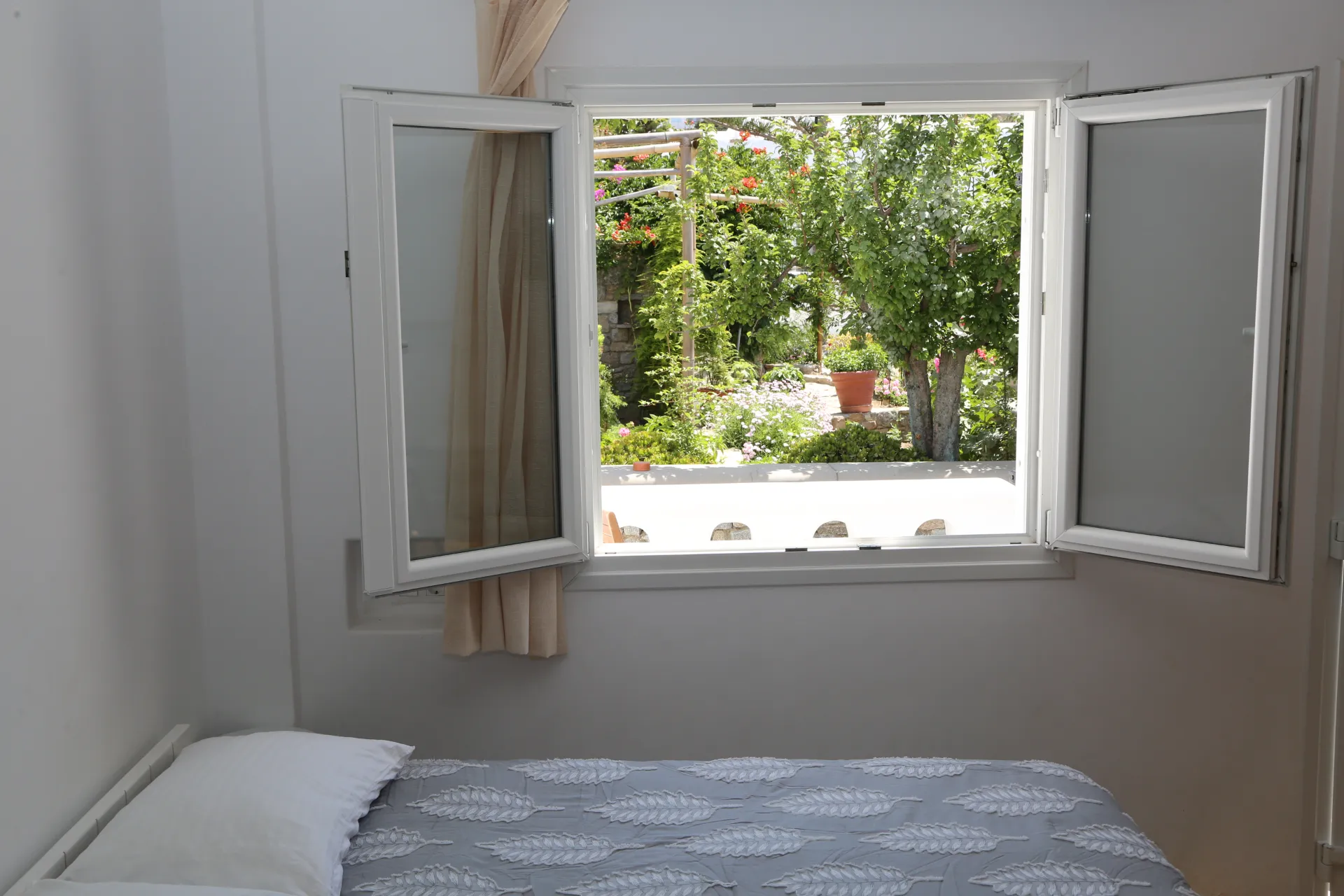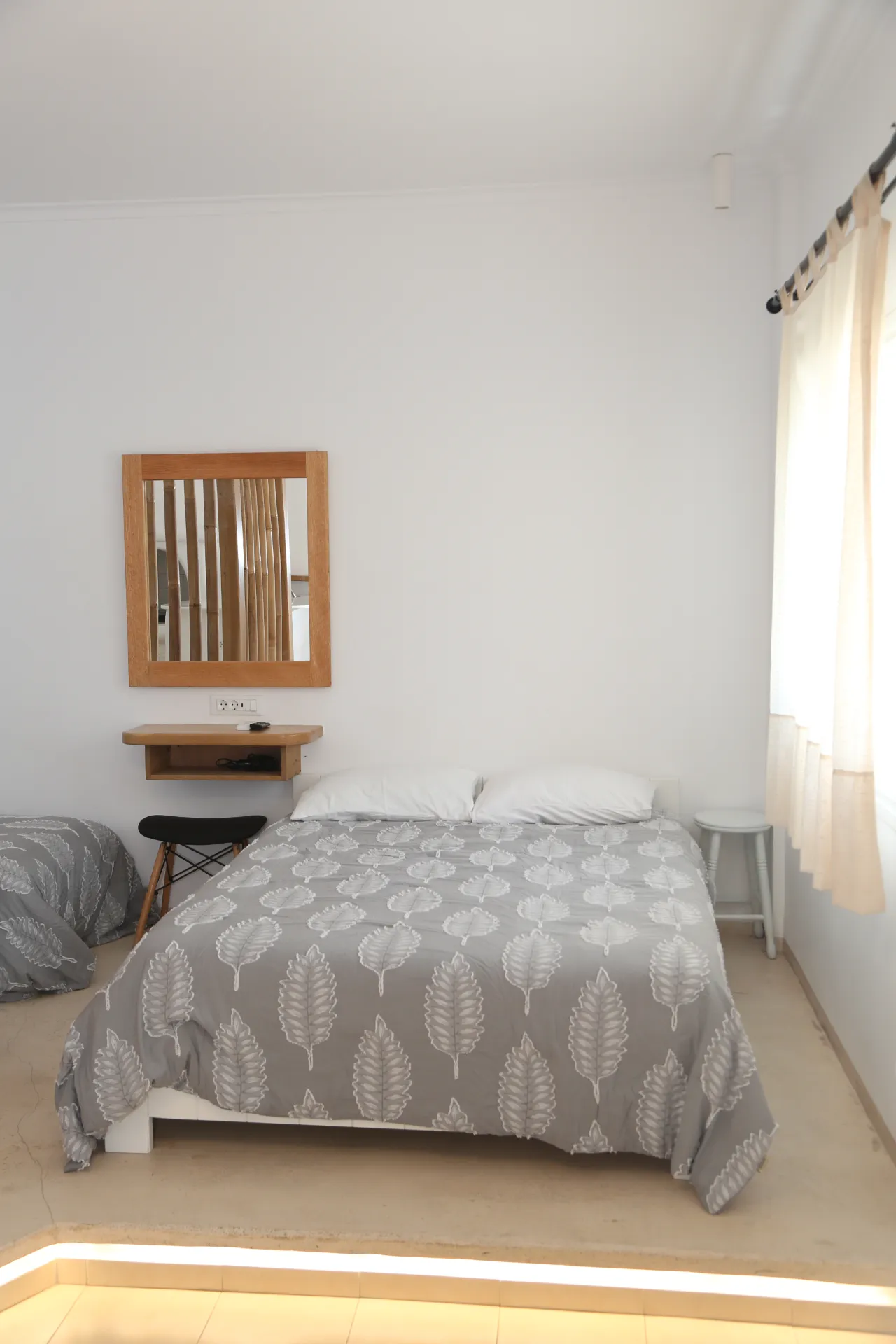 This single space studio (35 m²) represents a successful architectural fusion of traditional and modern elements. It features a double bed, two single beds, and a built-in sofa bed, as well as a fully equipped kitchen with utensils, a refrigerator, a coffee maker, a microwave, air conditioning, and a flat-screen smart TV. The most striking design element is the bathroom, with its distinctive dome, tiered flooring, separate wooden fixtures, and concealed lighting. The outdoor terrace, with its built-in benches and garden views, is ideal for breakfast, lunch, or dinner. Enjoy a wonderful stay. Experience traditional hospitality at Anais's. The Deluxe quintuple studio can accommodate up to 5 people.