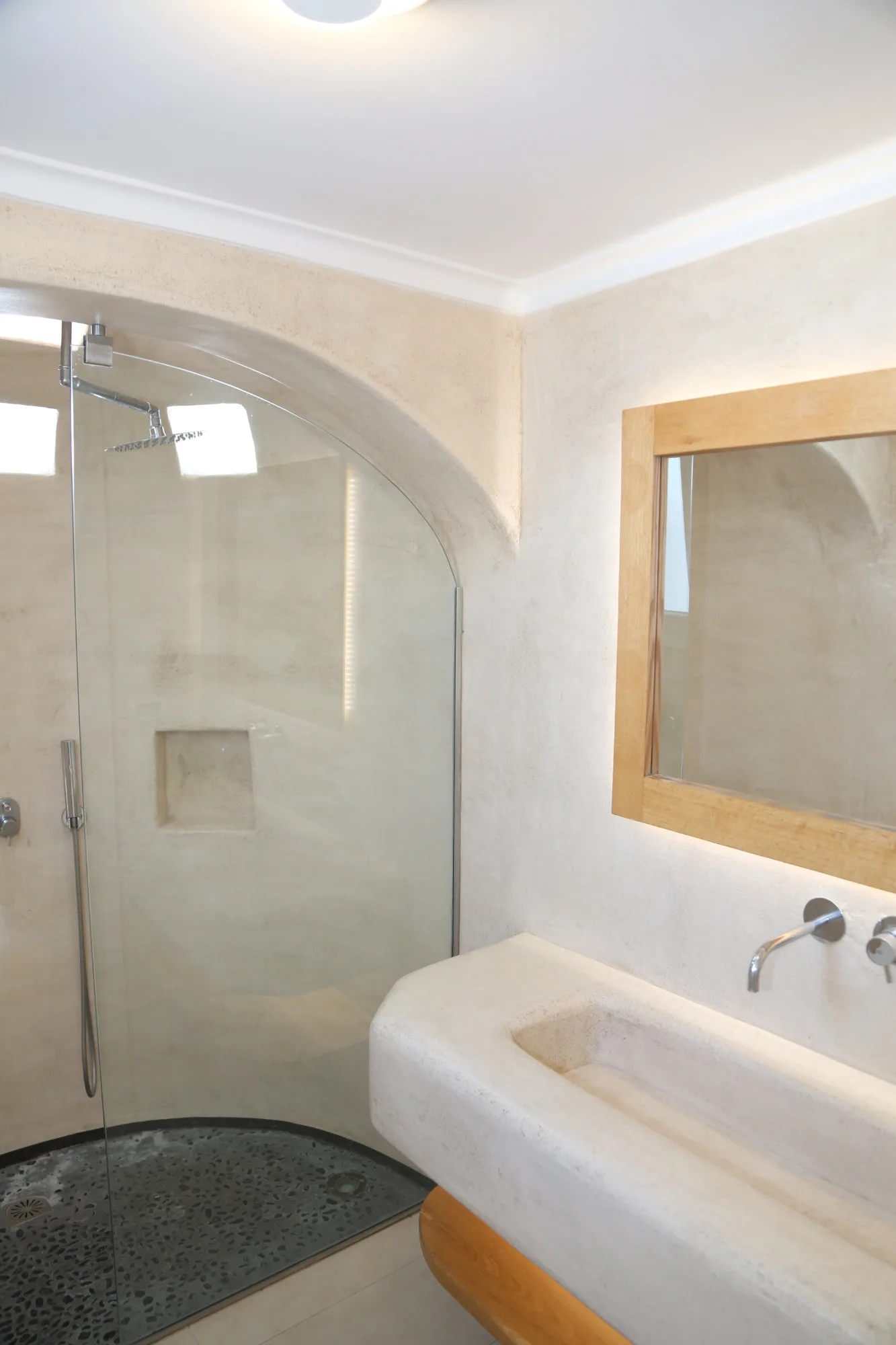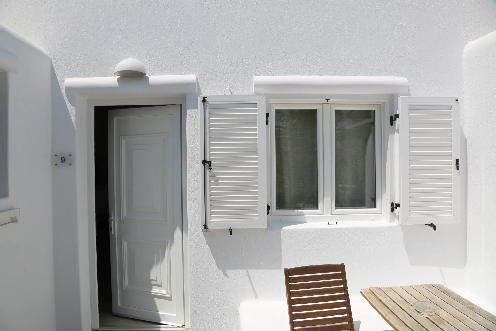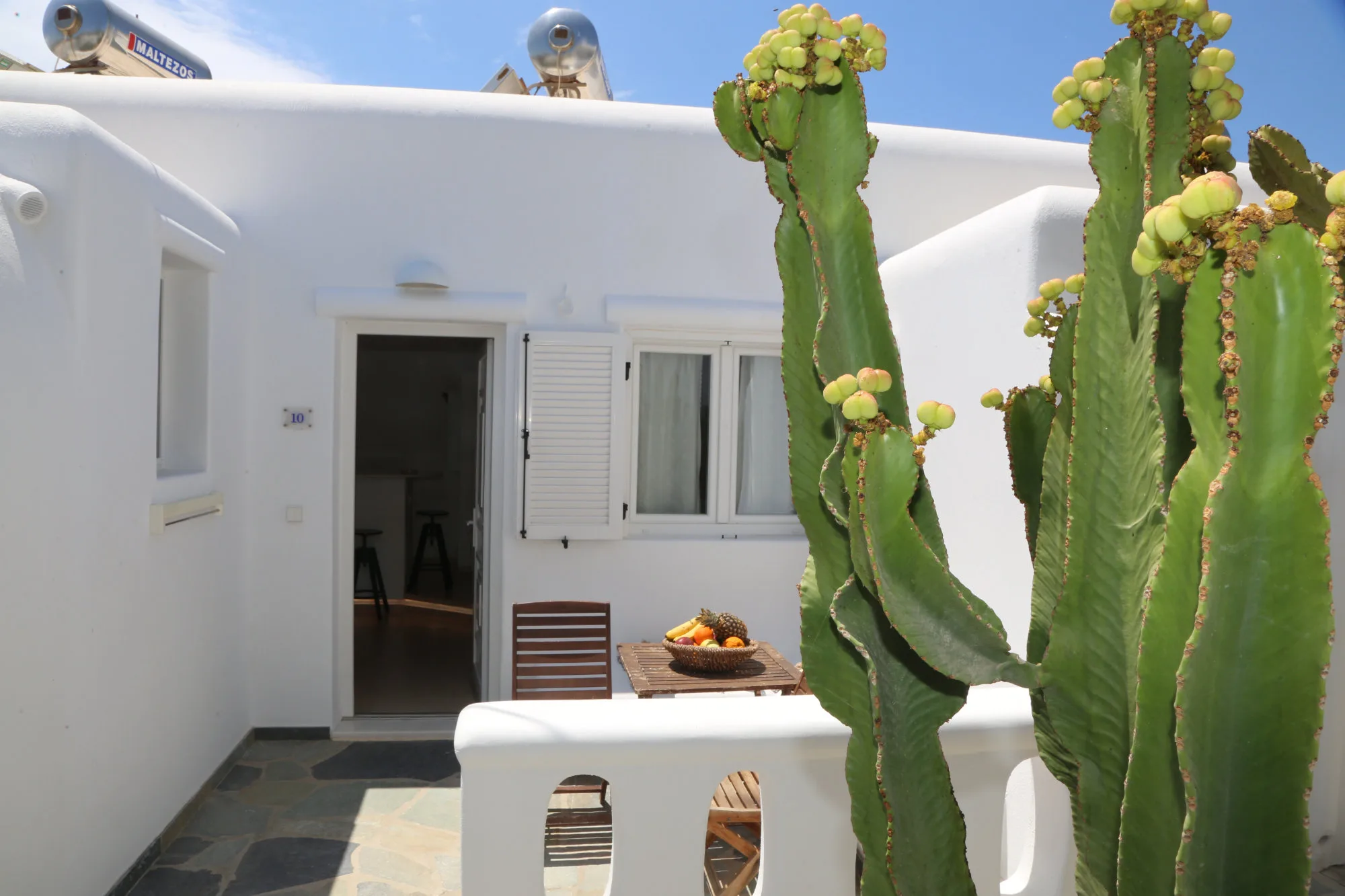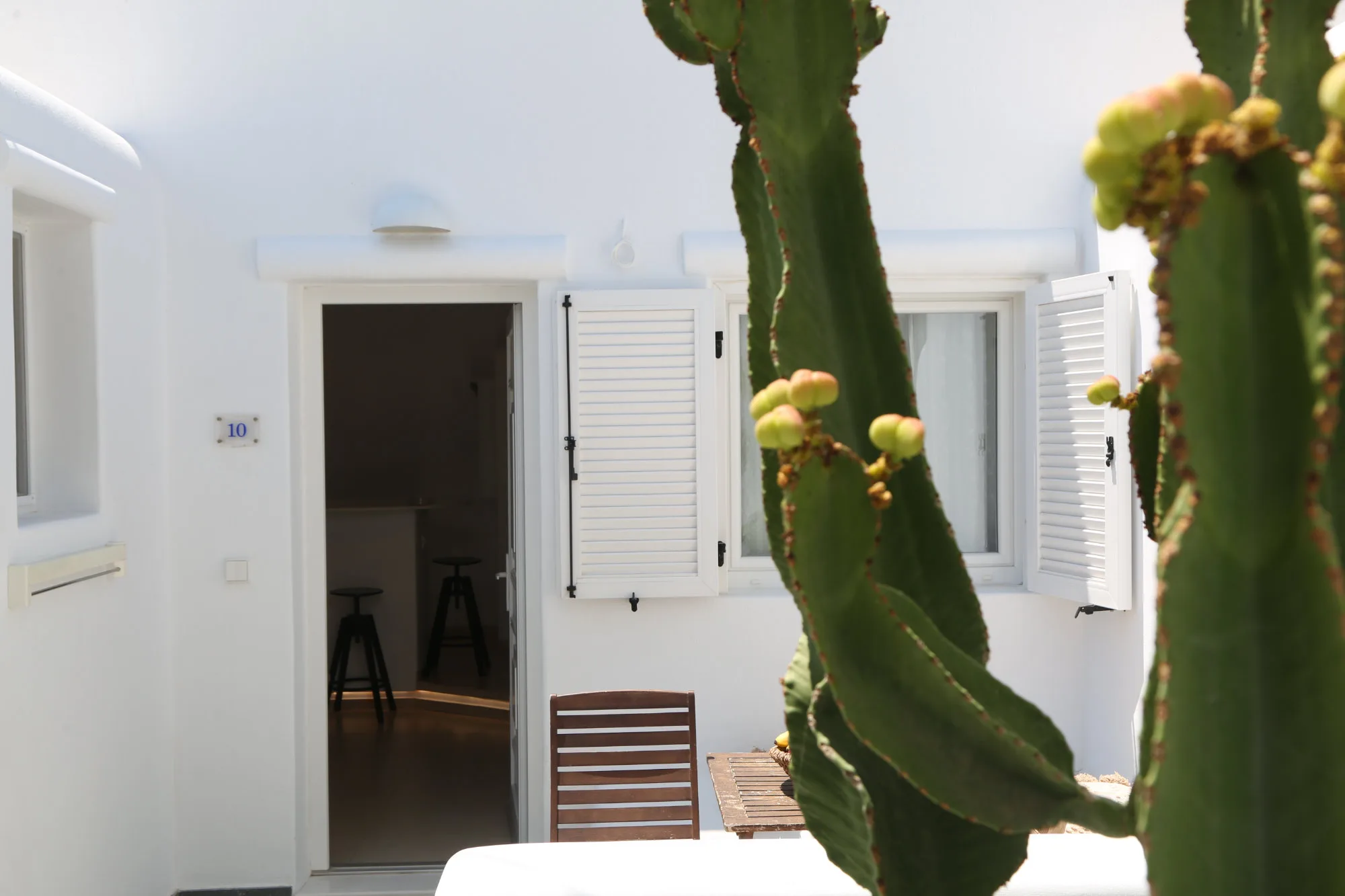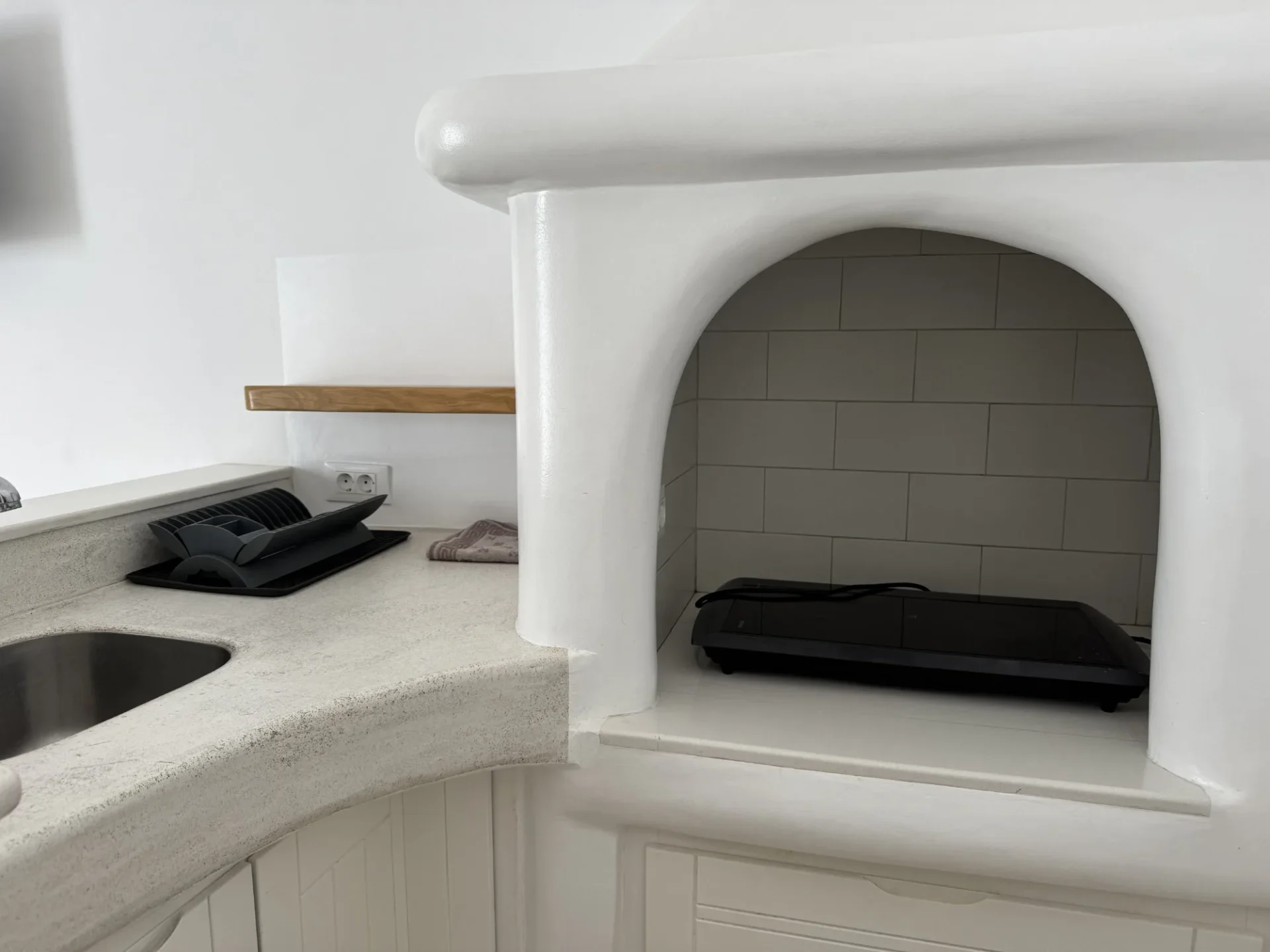This single space studio (35 m²) represents a successful architectural fusion of traditional and modern elements. It features a double bed, two single beds, and a built-in sofa bed, as well as a fully equipped kitchen with utensils, a refrigerator, a coffee maker, a microwave, air conditioning, and a flat-screen smart TV. The most striking design element is the bathroom, with its distinctive dome, tiered flooring, separate wooden fixtures, and concealed lighting. The outdoor terrace, with its built-in benches and garden views, is ideal for breakfast, lunch, or dinner. Enjoy a wonderful stay. Experience traditional hospitality at Anais's. The Deluxe quintuple studio can accommodate up to 5 people.