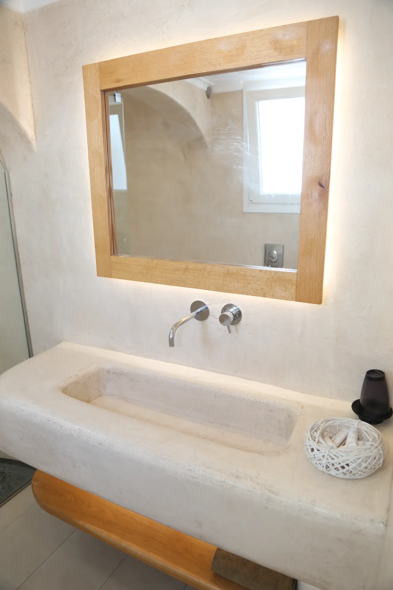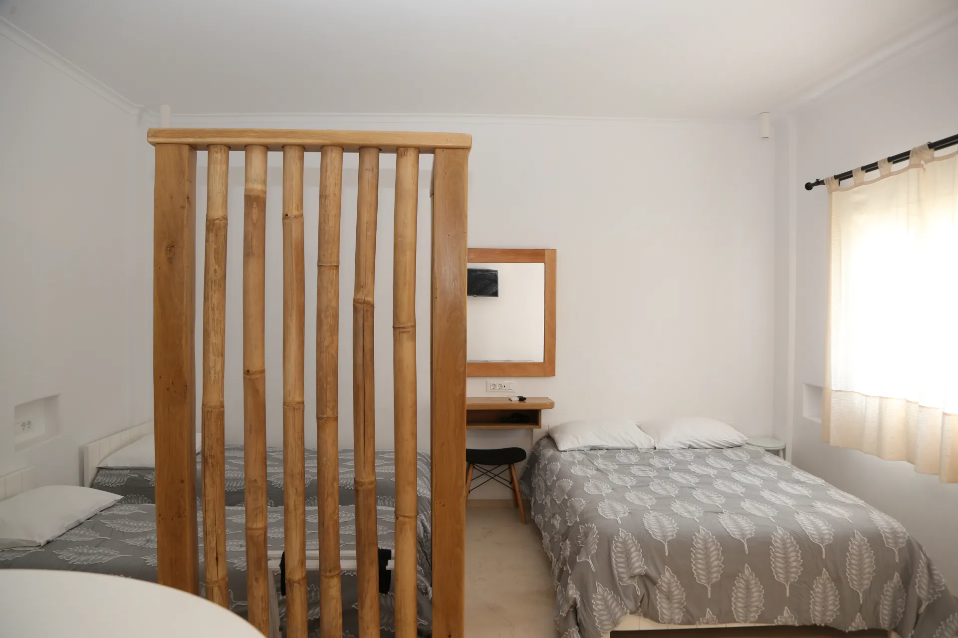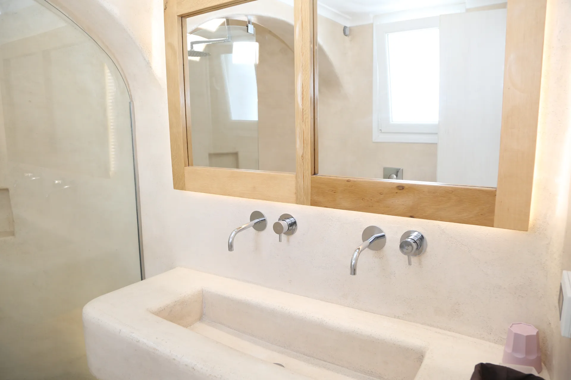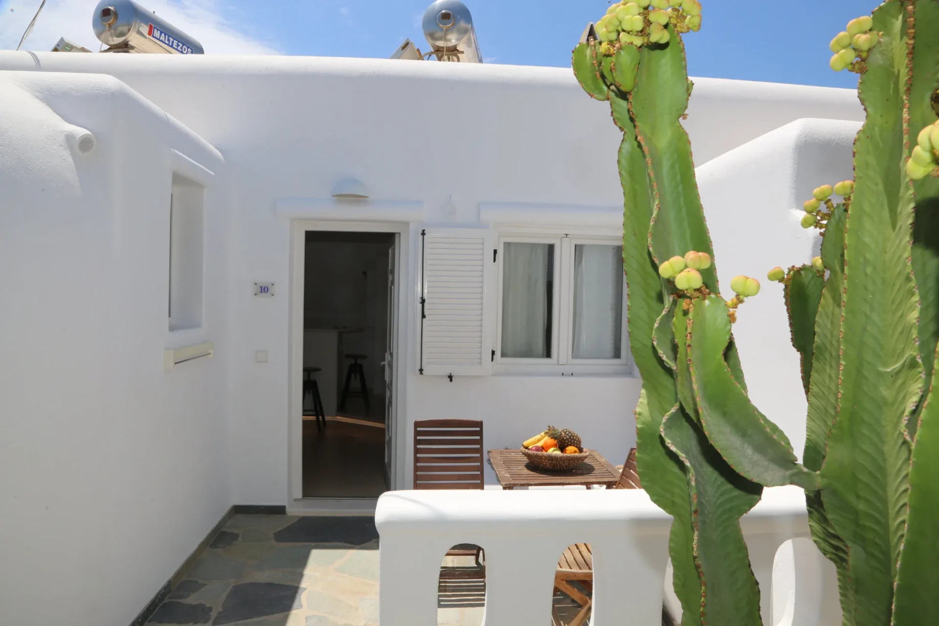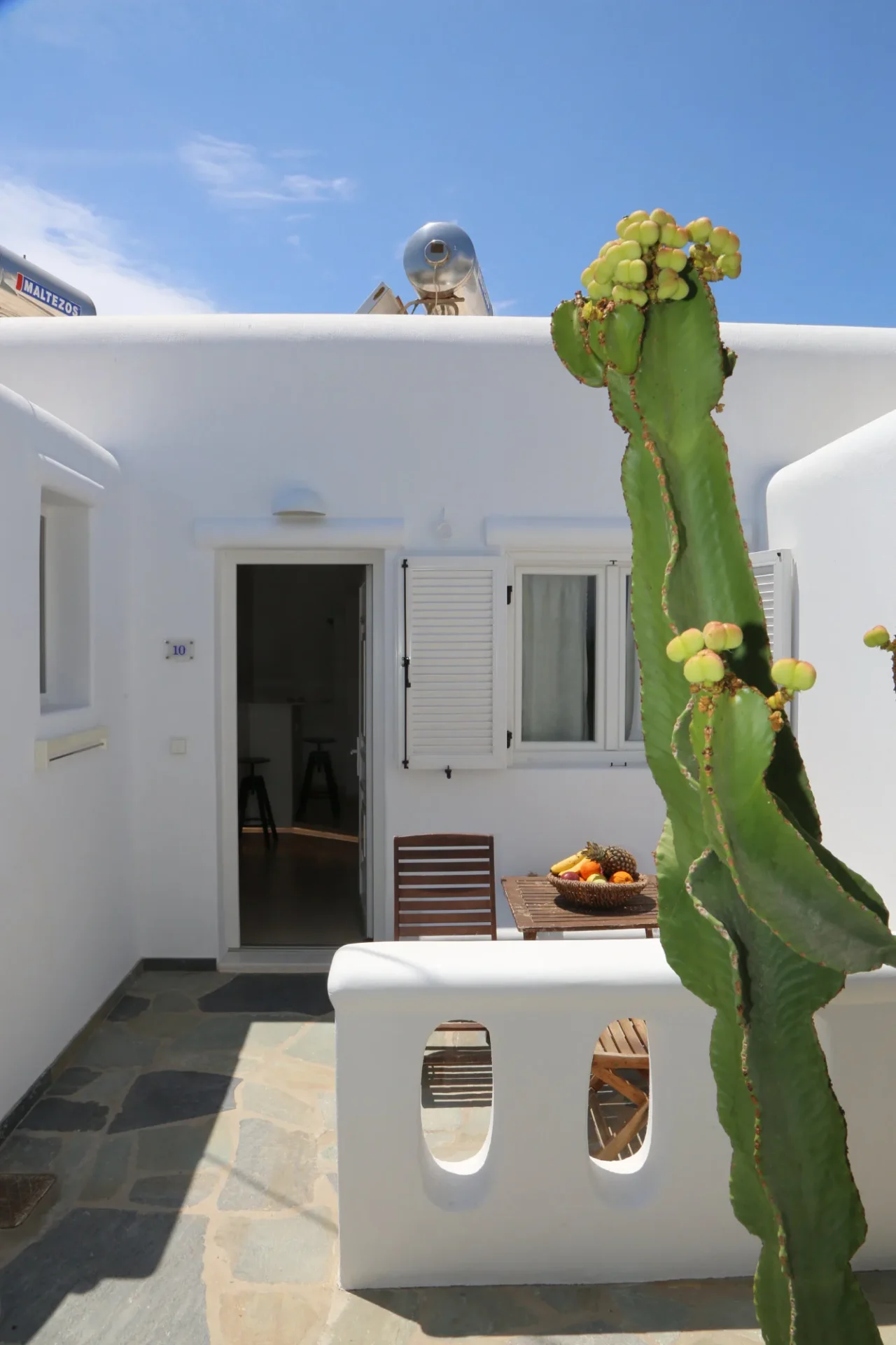 This single space studio (35 m²) represents a successful architectural fusion of traditional and modern elements. It features a double bed, two single beds, and a built-in sofa bed, as well as a fully equipped kitchen with utensils, a refrigerator, a coffee maker, a microwave, air conditioning, and a flat-screen smart TV. The most striking design element is the bathroom, with its distinctive dome, tiered flooring, separate wooden fixtures, and concealed lighting. The outdoor terrace, with its built-in benches and garden views, is ideal for breakfast, lunch, or dinner. Enjoy a wonderful stay. Experience traditional hospitality at Anais's. The Deluxe quintuple studio can accommodate up to 5 people.
