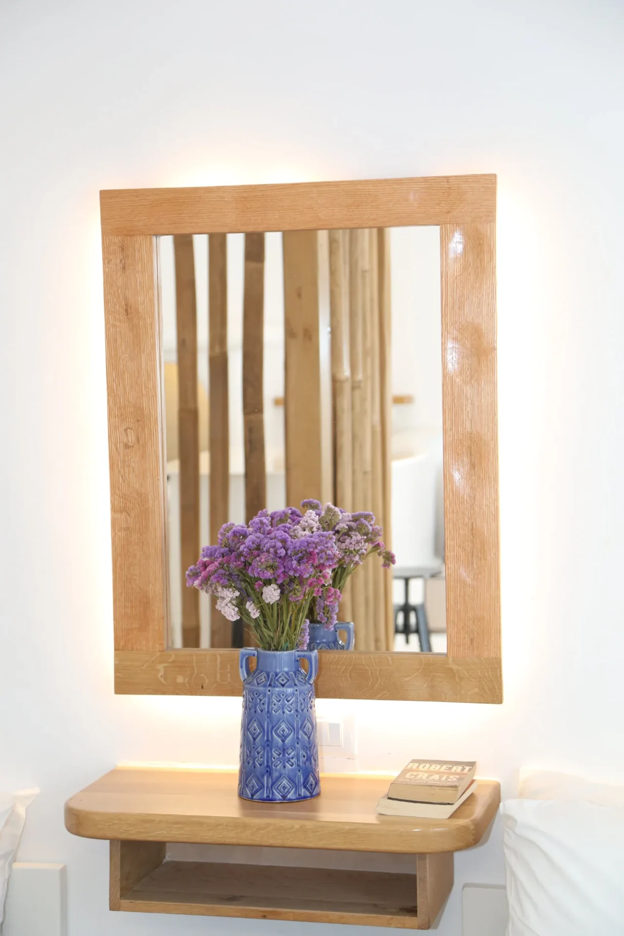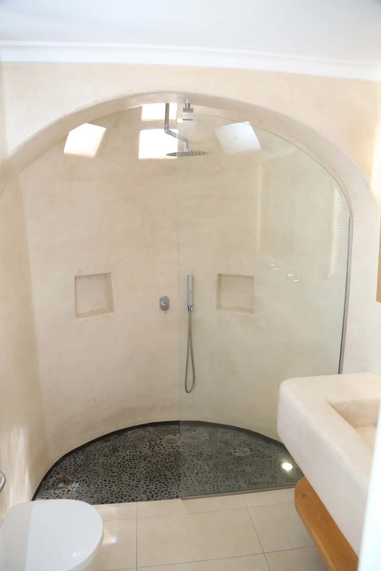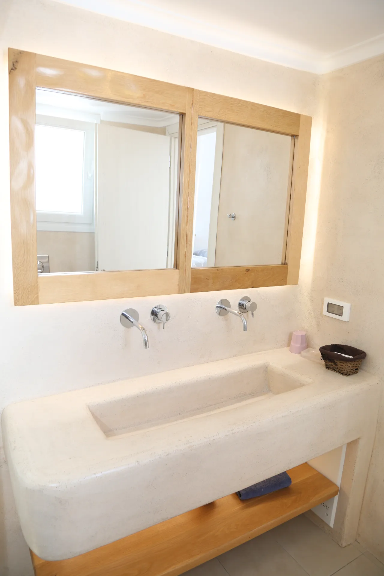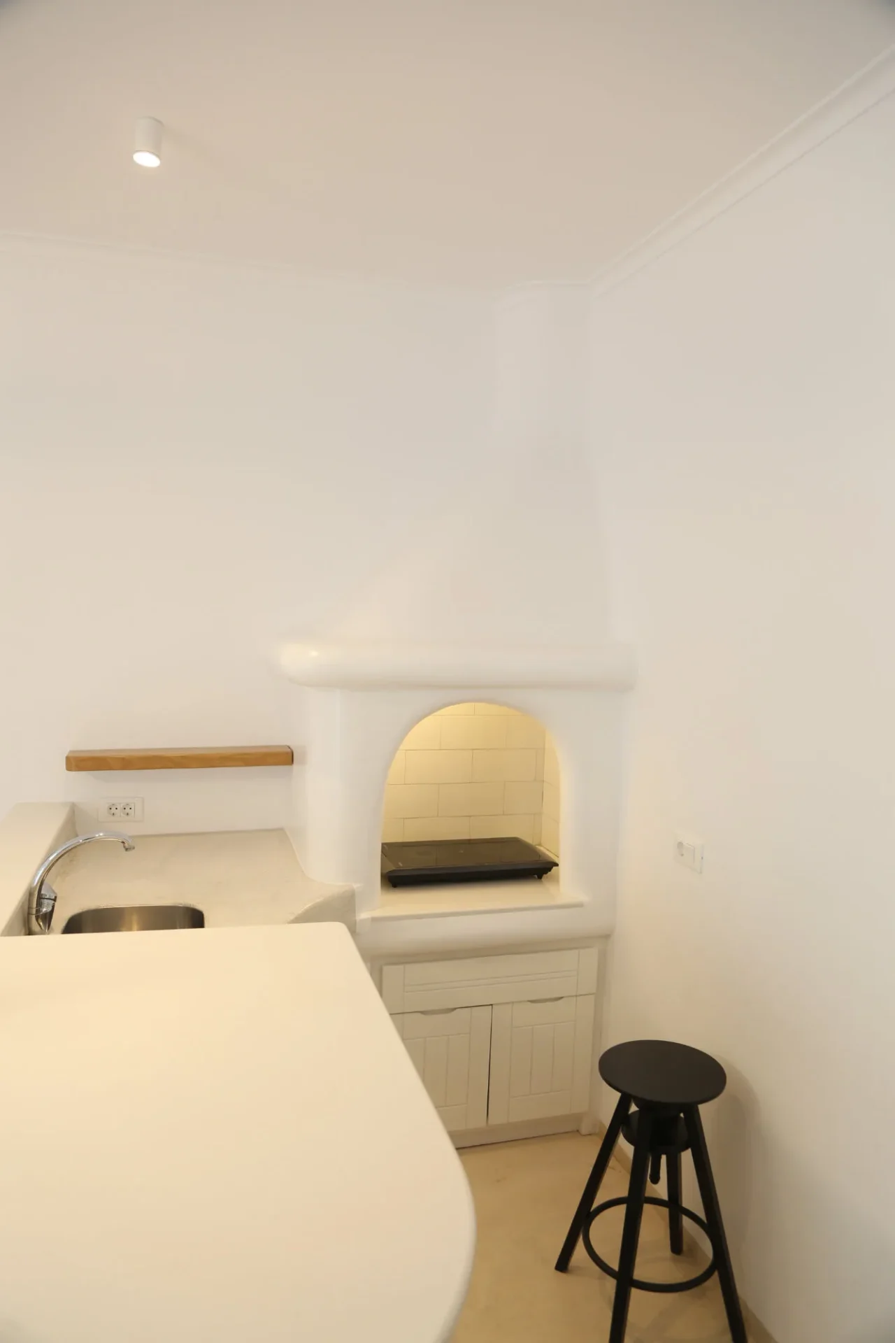 This single space studio (35 m²) represents a successful architectural fusion of traditional and modern elements. It features a double bed, two single beds, and a built-in sofa bed, as well as a fully equipped kitchen with utensils, a refrigerator, a coffee maker, a microwave, air conditioning, and a flat-screen smart TV. The most striking design element is the bathroom, with its distinctive dome, tiered flooring, separate wooden fixtures, and concealed lighting. The outdoor terrace, with its built-in benches and garden views, is ideal for breakfast, lunch, or dinner. Enjoy a wonderful stay. Experience traditional hospitality at Anais's. The Deluxe quintuple studio can accommodate up to 5 people.