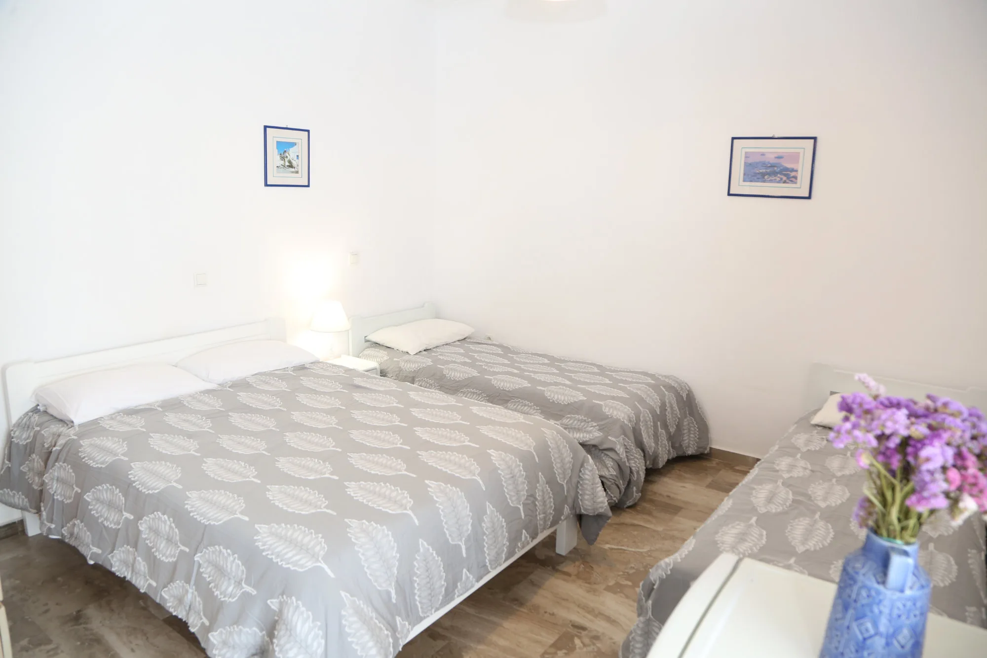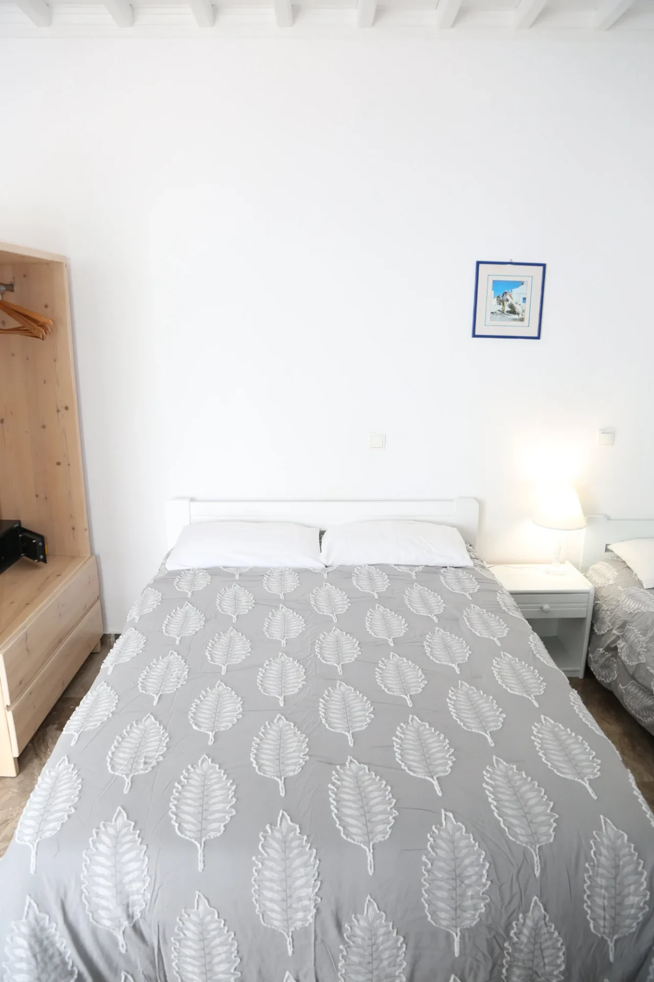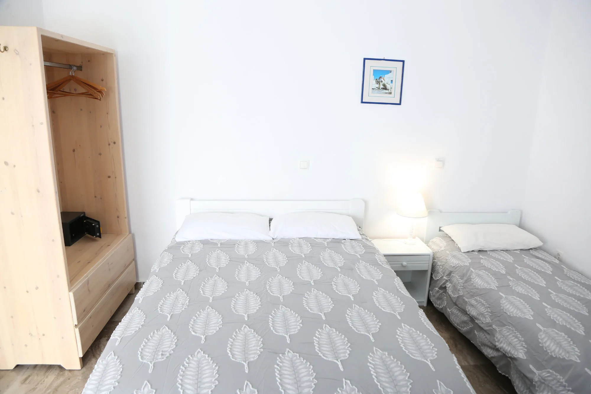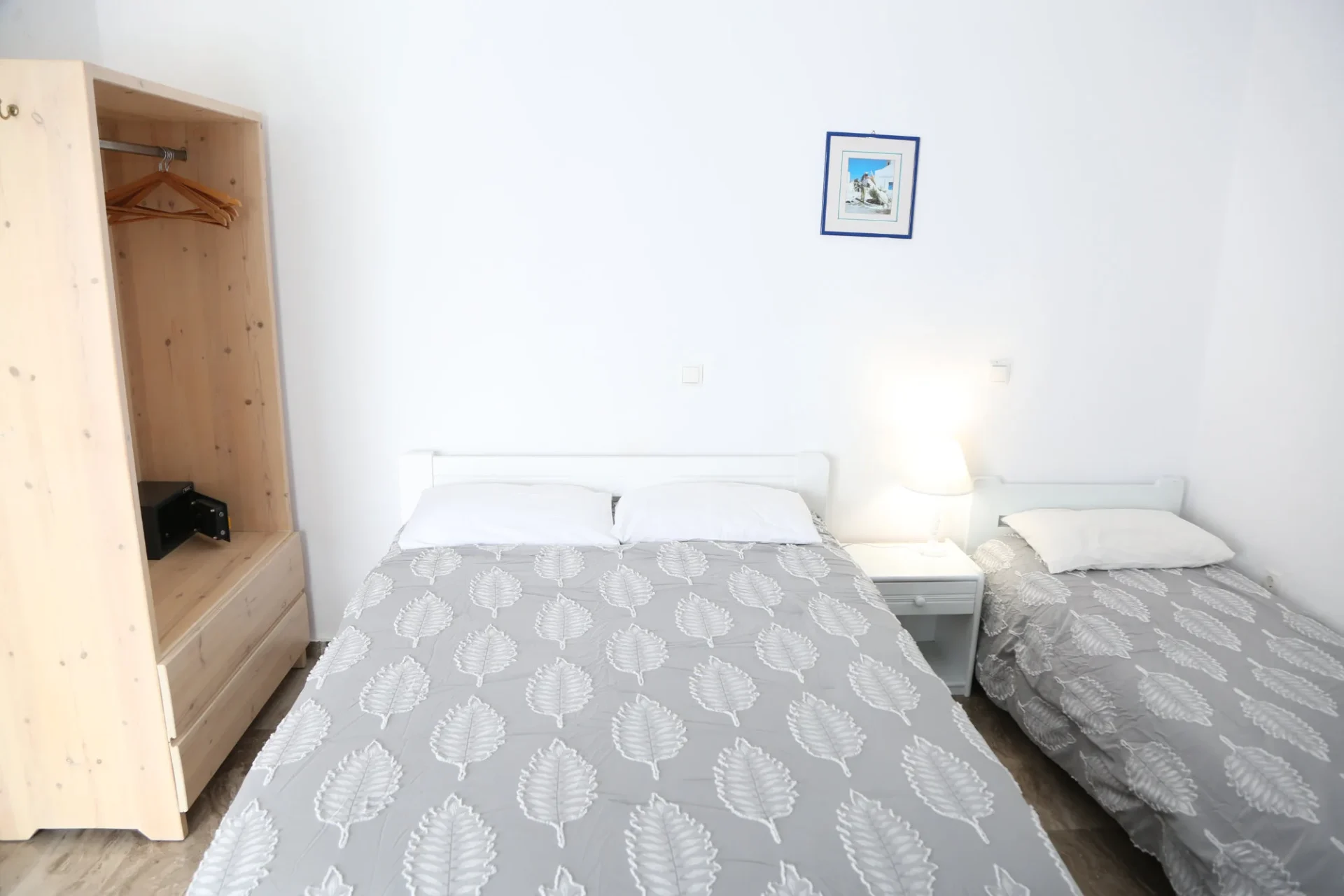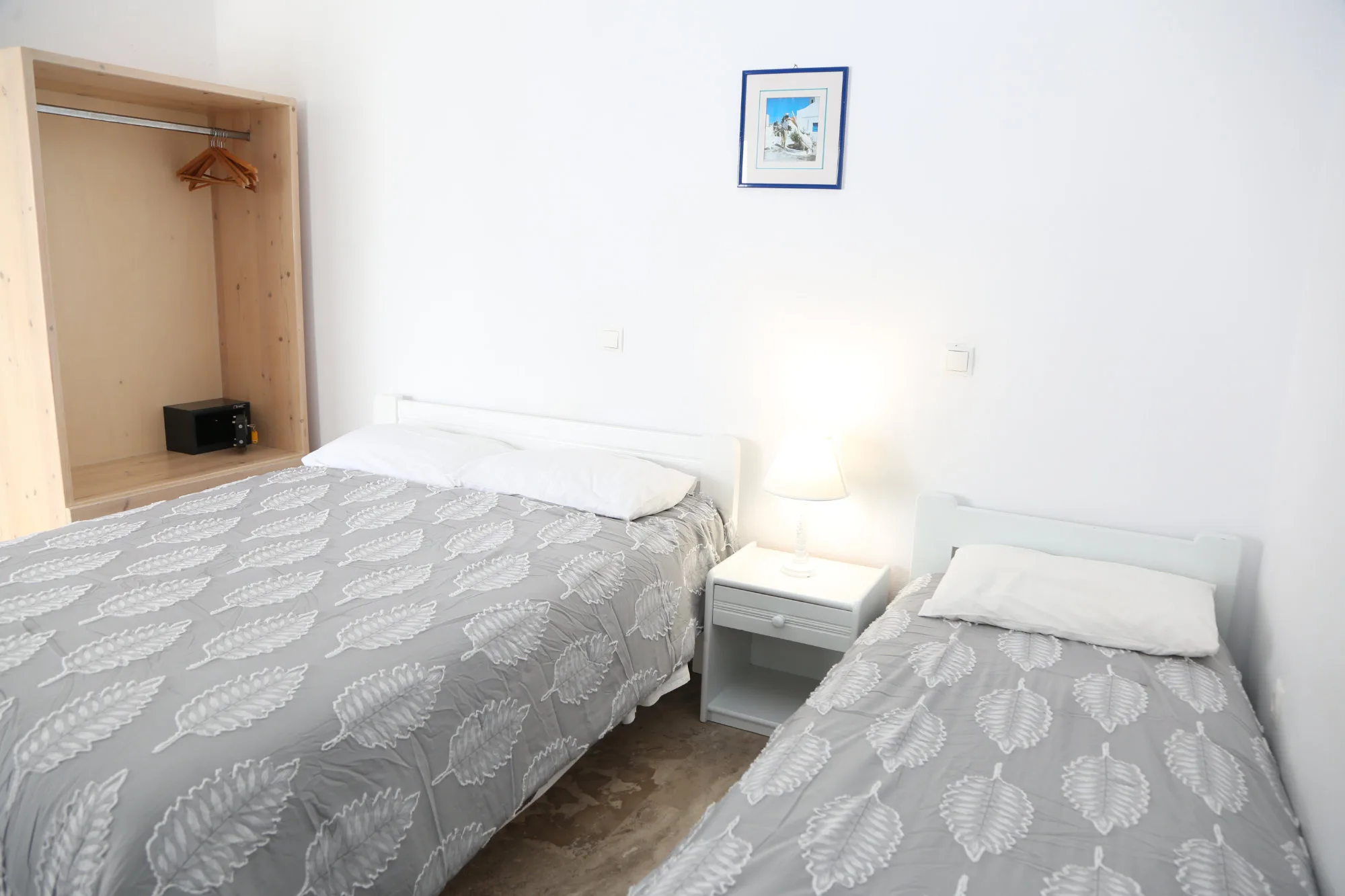 This one space room (22 sq.m) without kitchenette has one double bed and two single beds, air conditioning, free wi-fi, safety deposit box and refrigerator. It has a private balcony giving to the square area on the side of the premises with views of the garden. This room is the only one that doesn’t have a kitchen but nevertheless has all the comfort you need for a short or long and enjoyable stay, with its straight lines design and comfortable beds. The quadruple room without kitchenette can sleep up to four people.