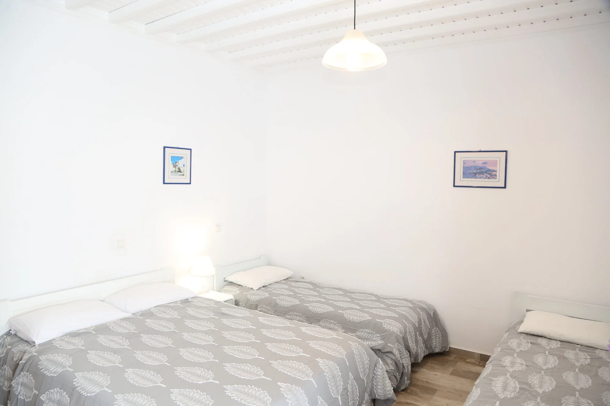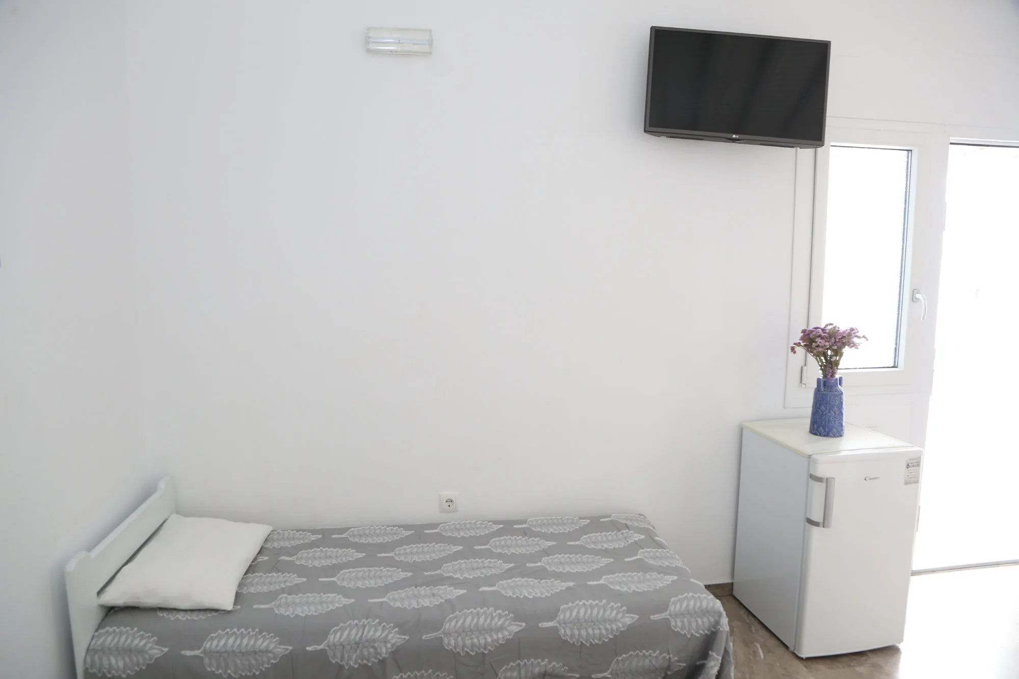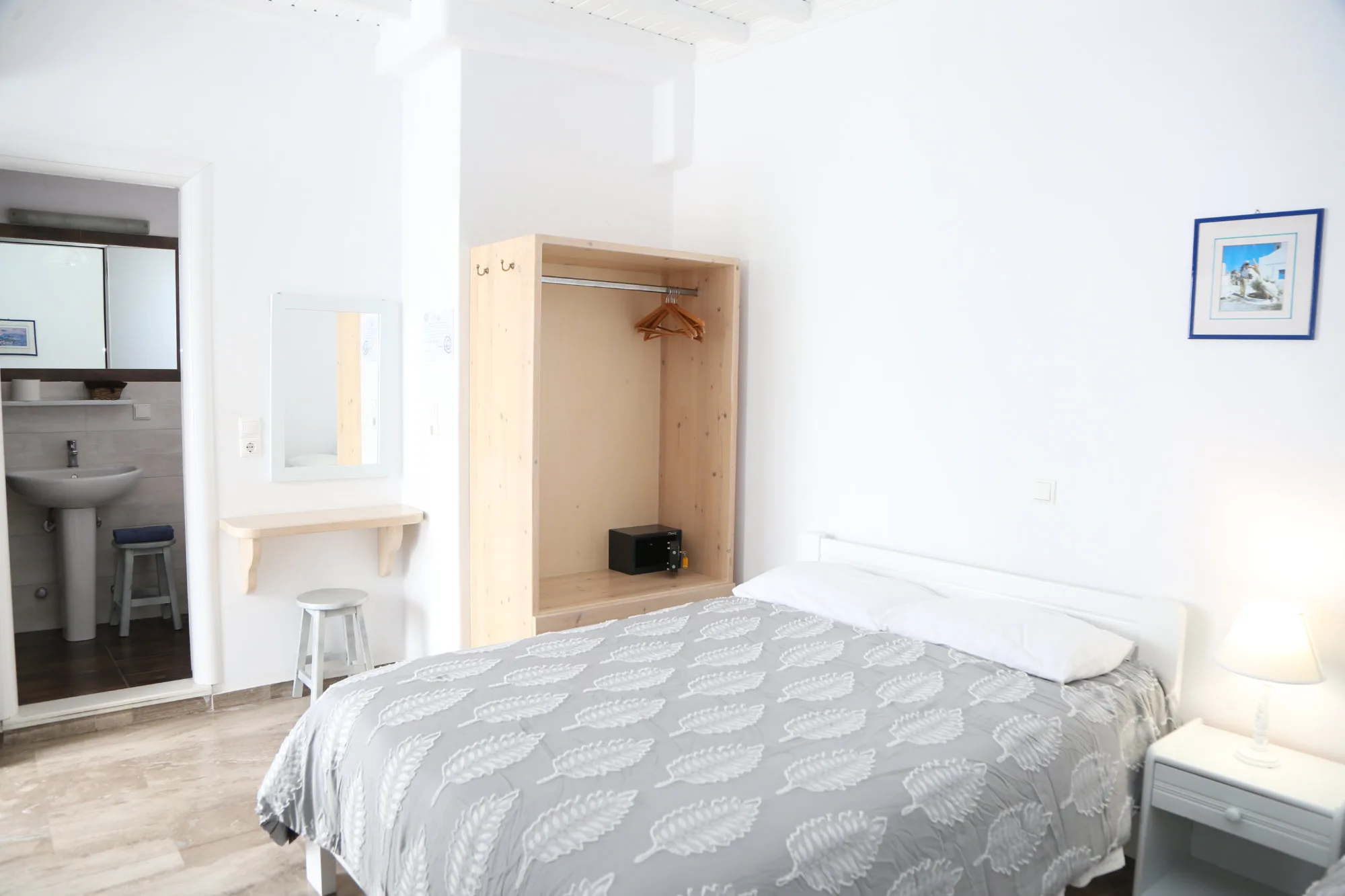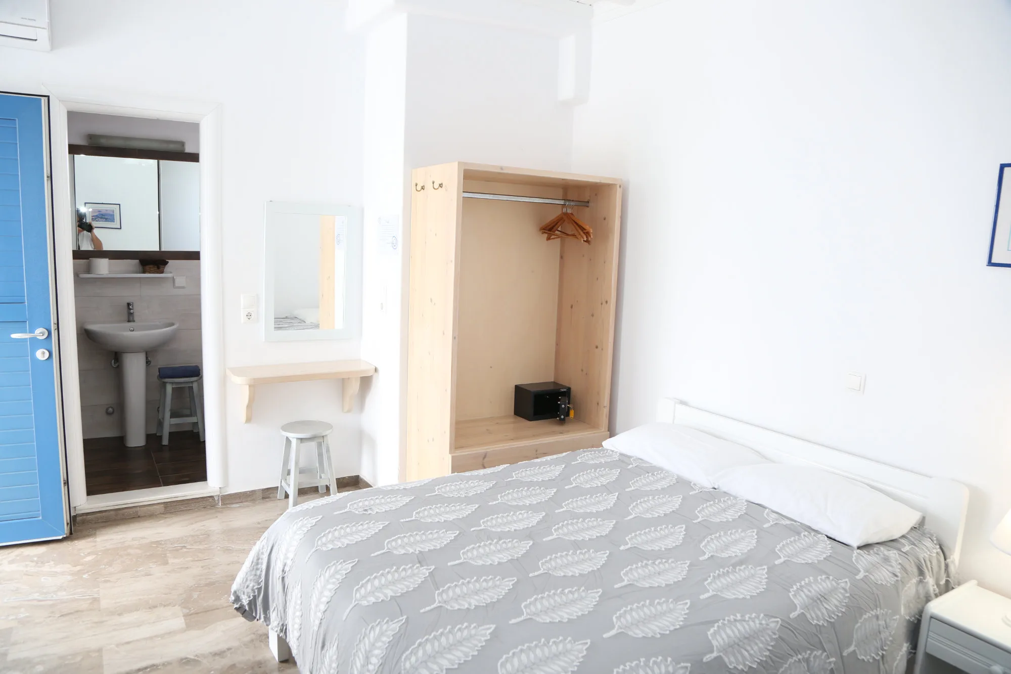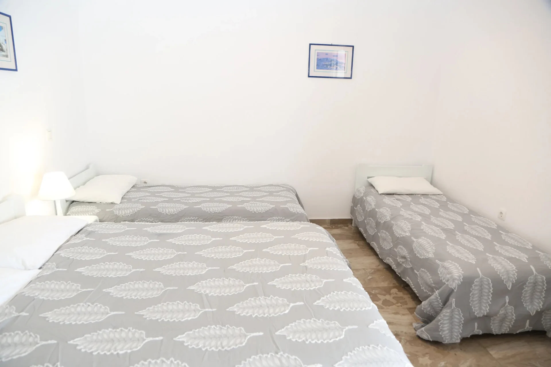 This one space room (22 sq.m) without kitchenette has one double bed and two single beds, air conditioning, free wi-fi, safety deposit box and refrigerator. It has a private balcony giving to the square area on the side of the premises with views of the garden. This room is the only one that doesn’t have a kitchen but nevertheless has all the comfort you need for a short or long and enjoyable stay, with its straight lines design and comfortable beds. The quadruple room without kitchenette can sleep up to four people.
