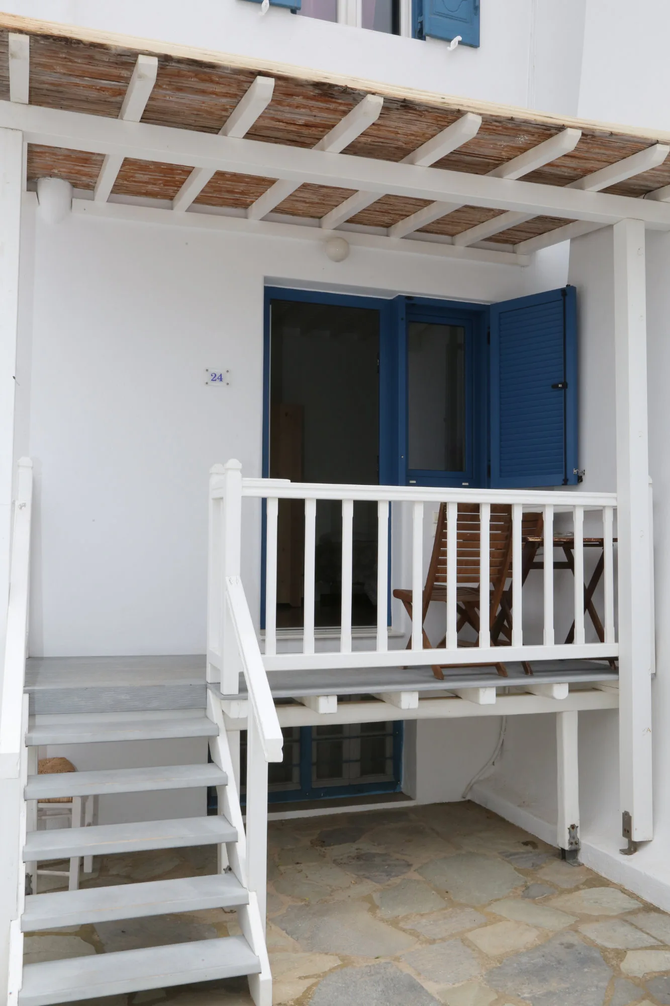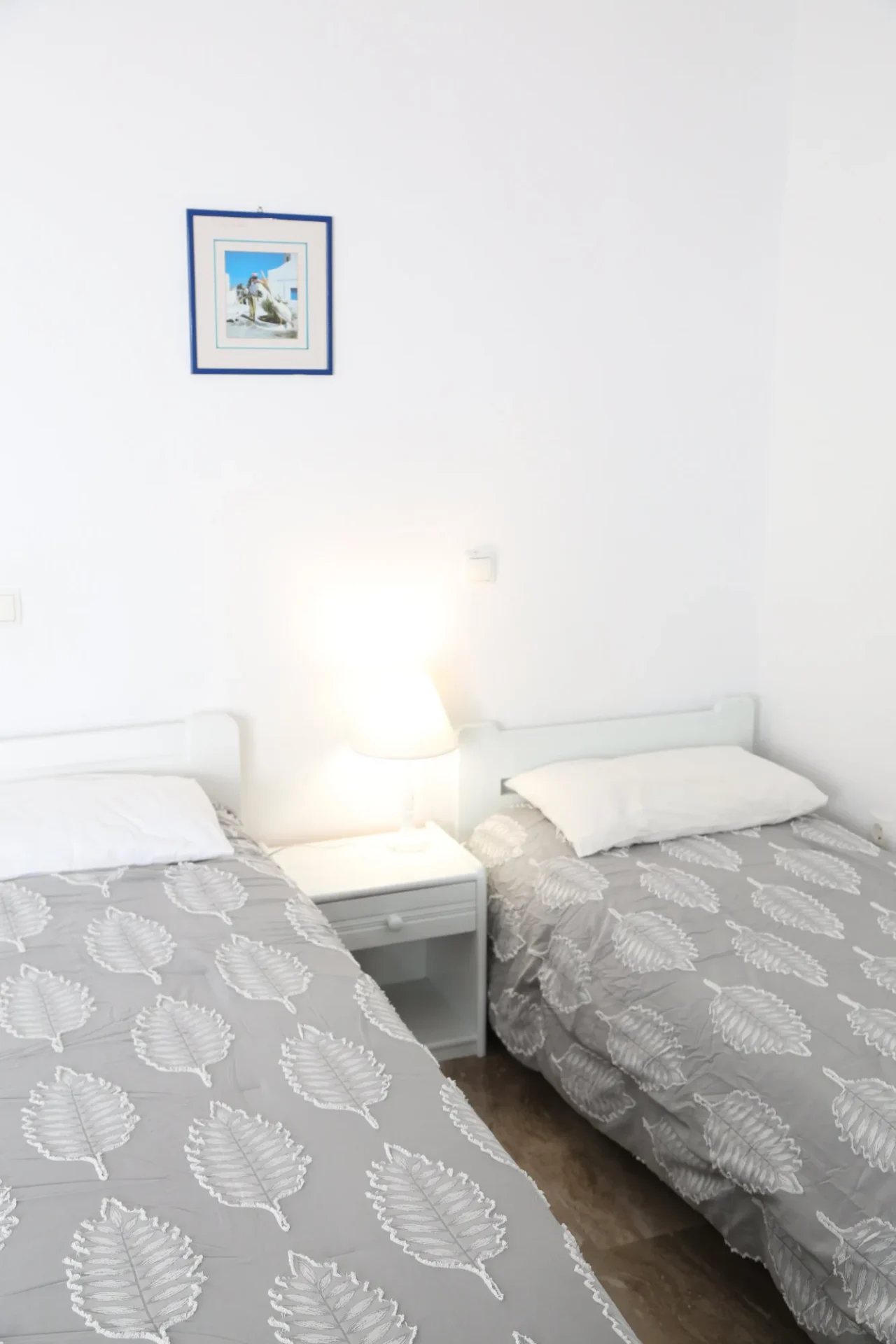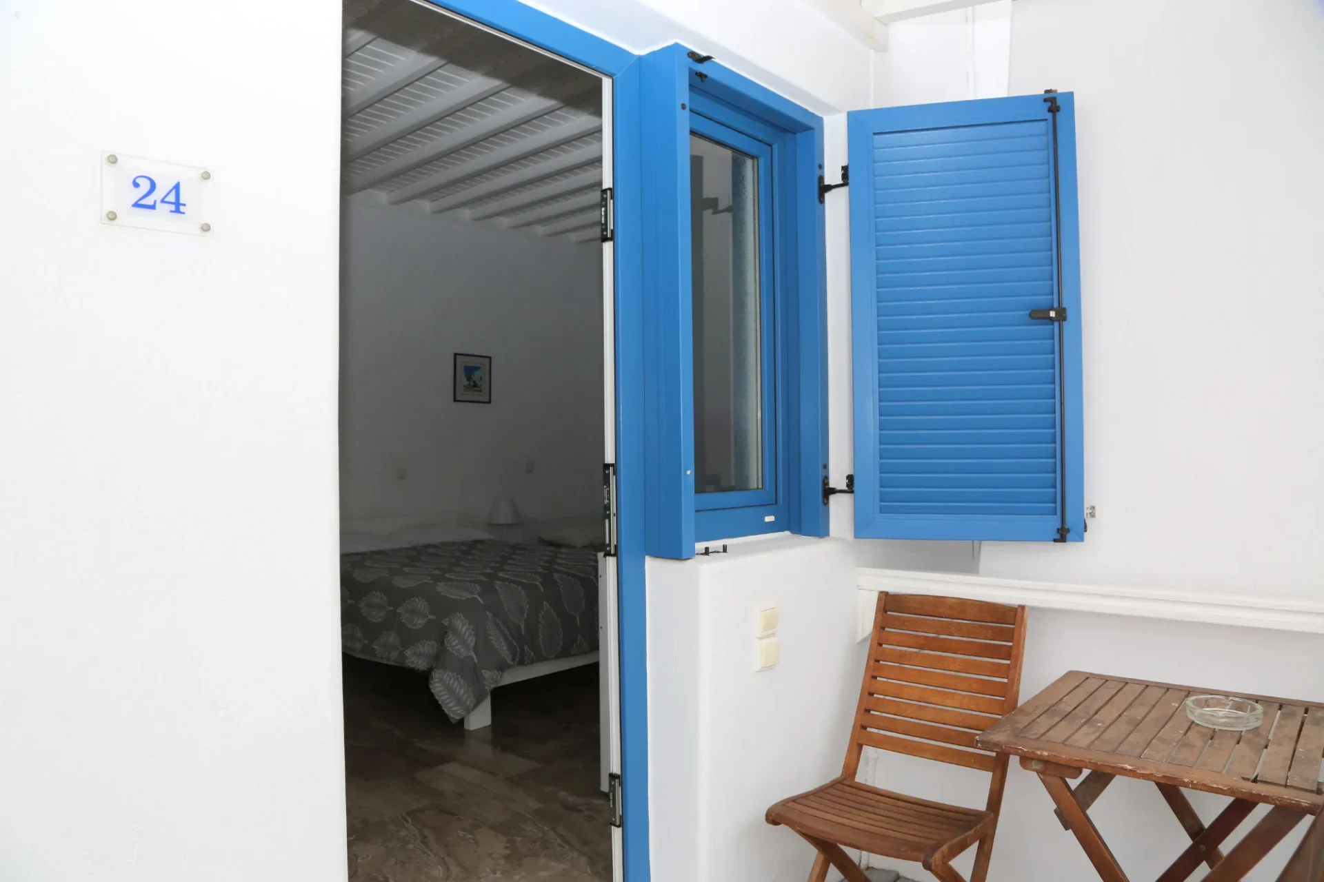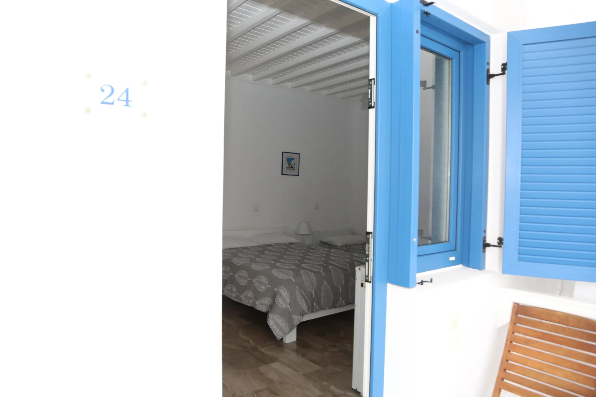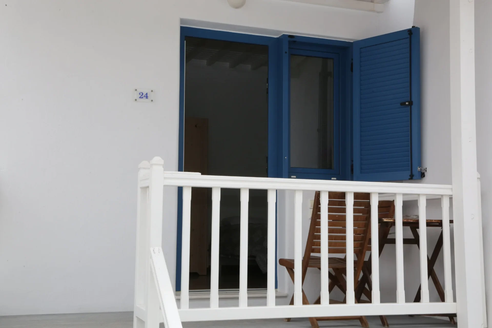 This one space room (22 sq.m) without kitchenette has one double bed and two single beds, air conditioning, free wi-fi, safety deposit box and refrigerator. It has a private balcony giving to the square area on the side of the premises with views of the garden. This room is the only one that doesn’t have a kitchen but nevertheless has all the comfort you need for a short or long and enjoyable stay, with its straight lines design and comfortable beds. The quadruple room without kitchenette can sleep up to four people.