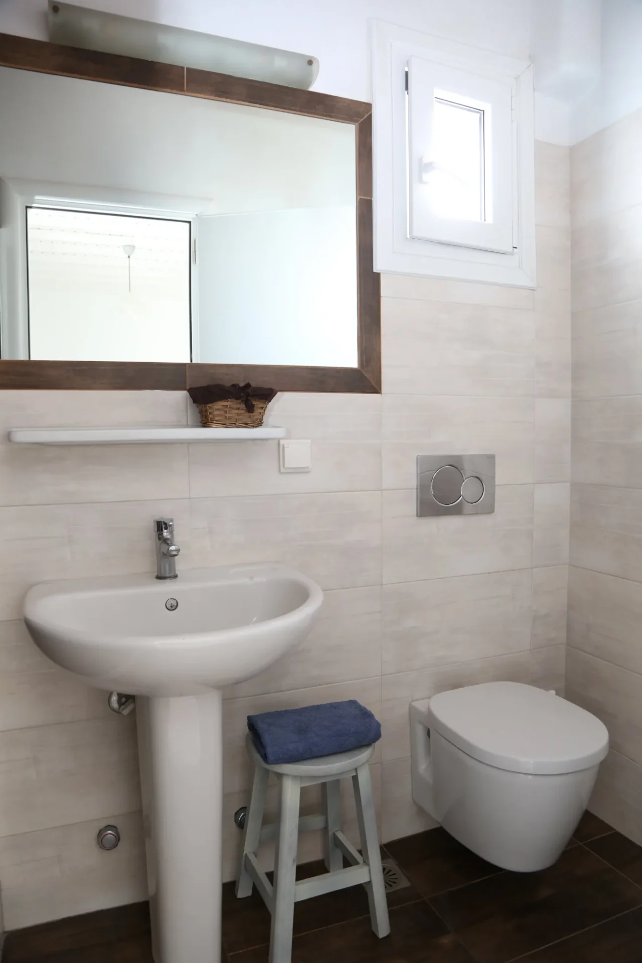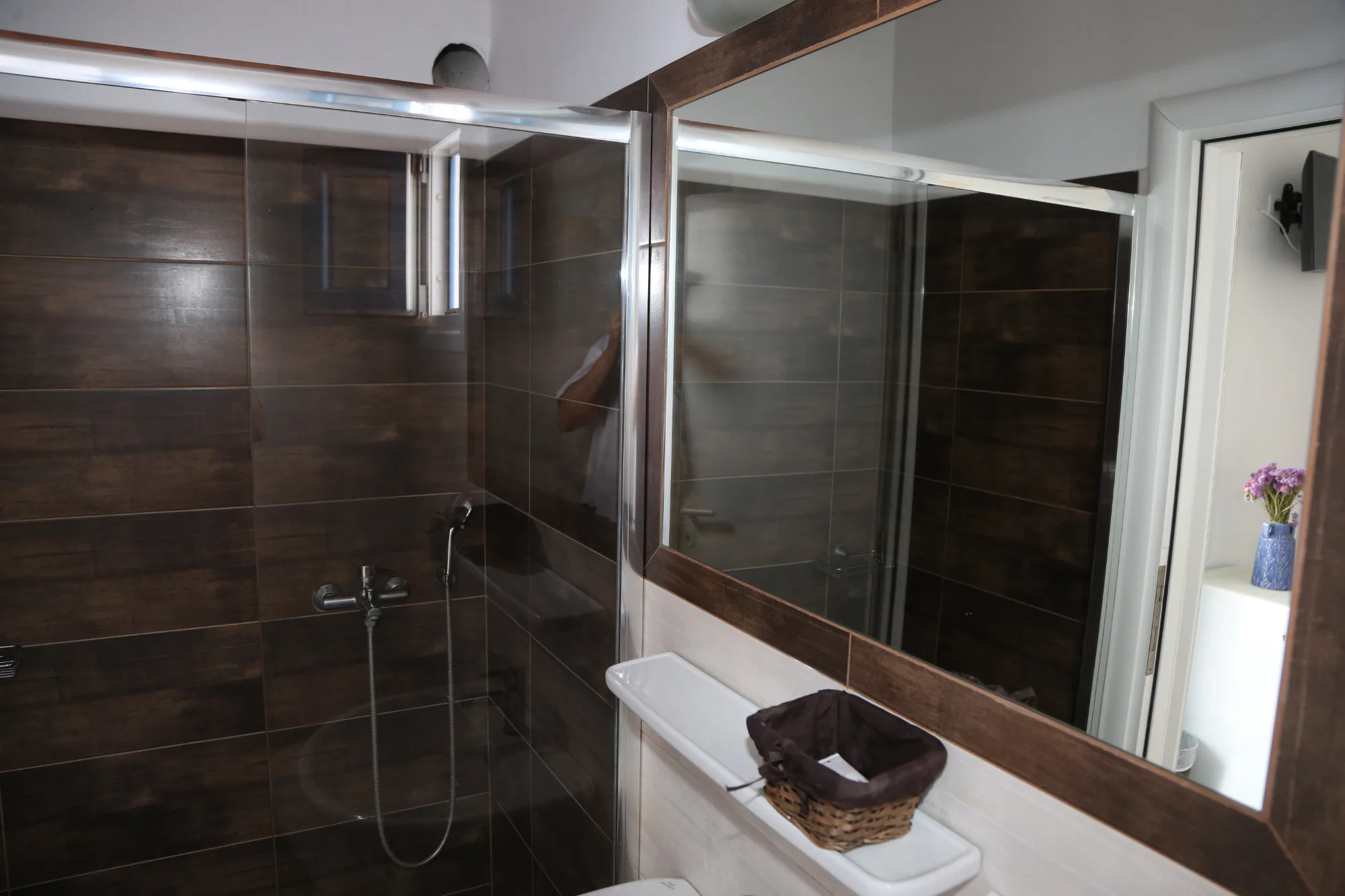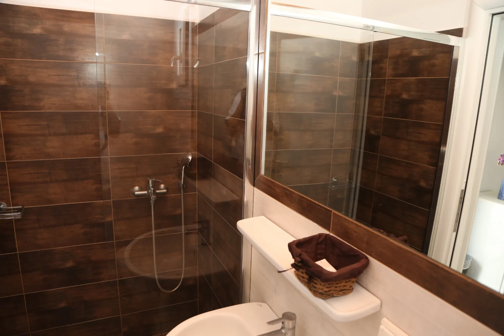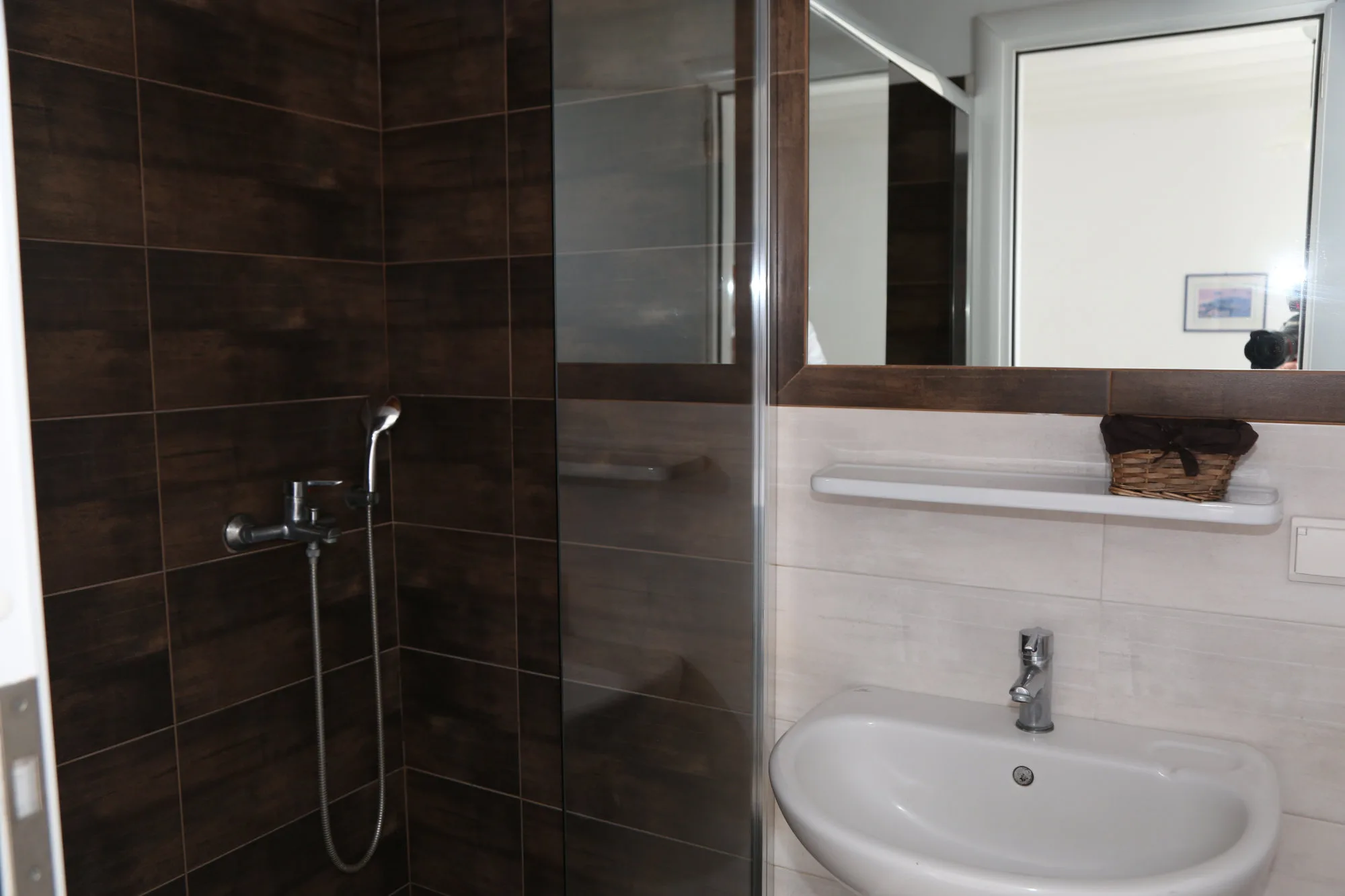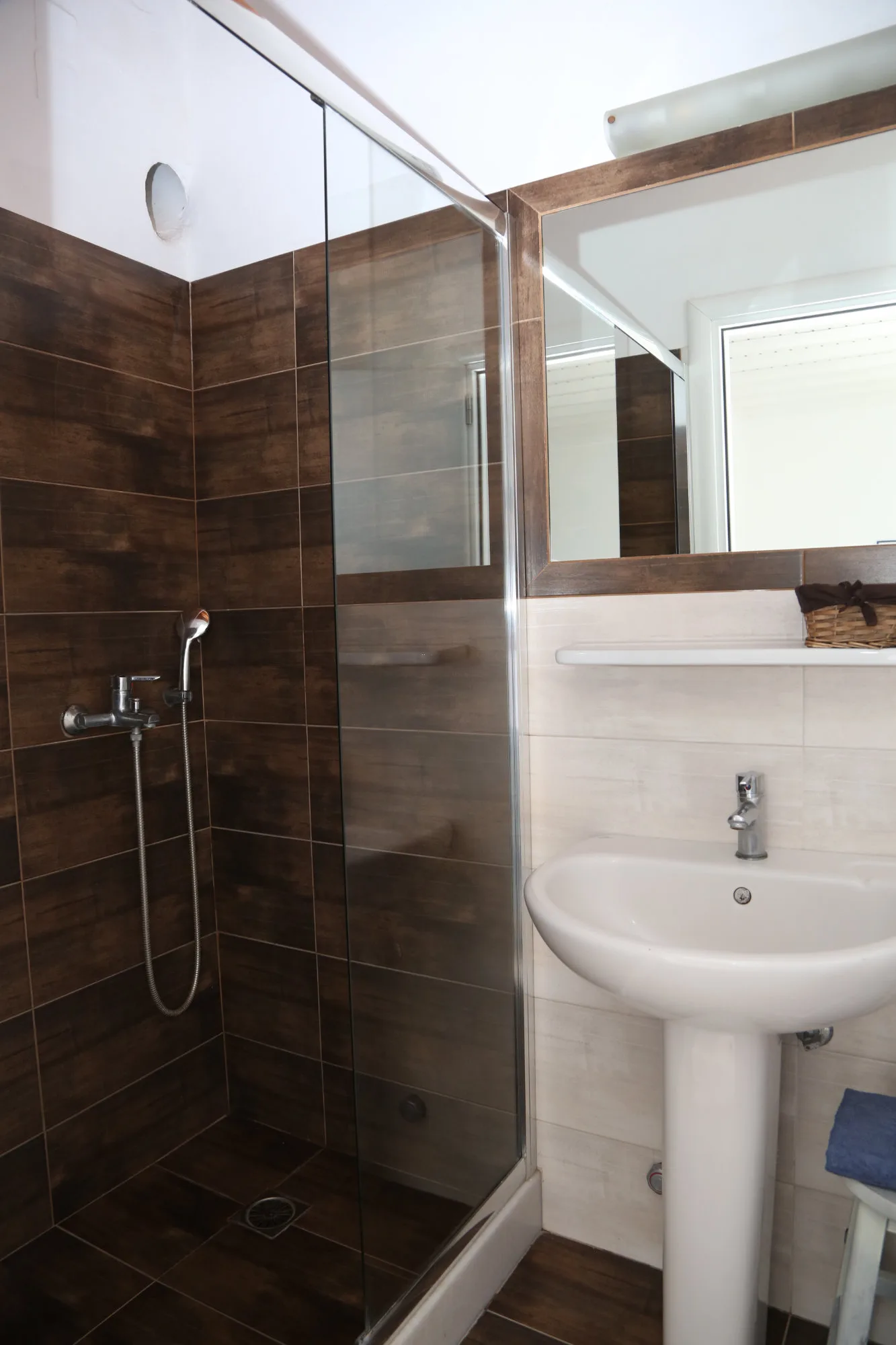 This one space room (22 sq.m) without kitchenette has one double bed and two single beds, air conditioning, free wi-fi, safety deposit box and refrigerator. It has a private balcony giving to the square area on the side of the premises with views of the garden. This room is the only one that doesn’t have a kitchen but nevertheless has all the comfort you need for a short or long and enjoyable stay, with its straight lines design and comfortable beds. The quadruple room without kitchenette can sleep up to four people.