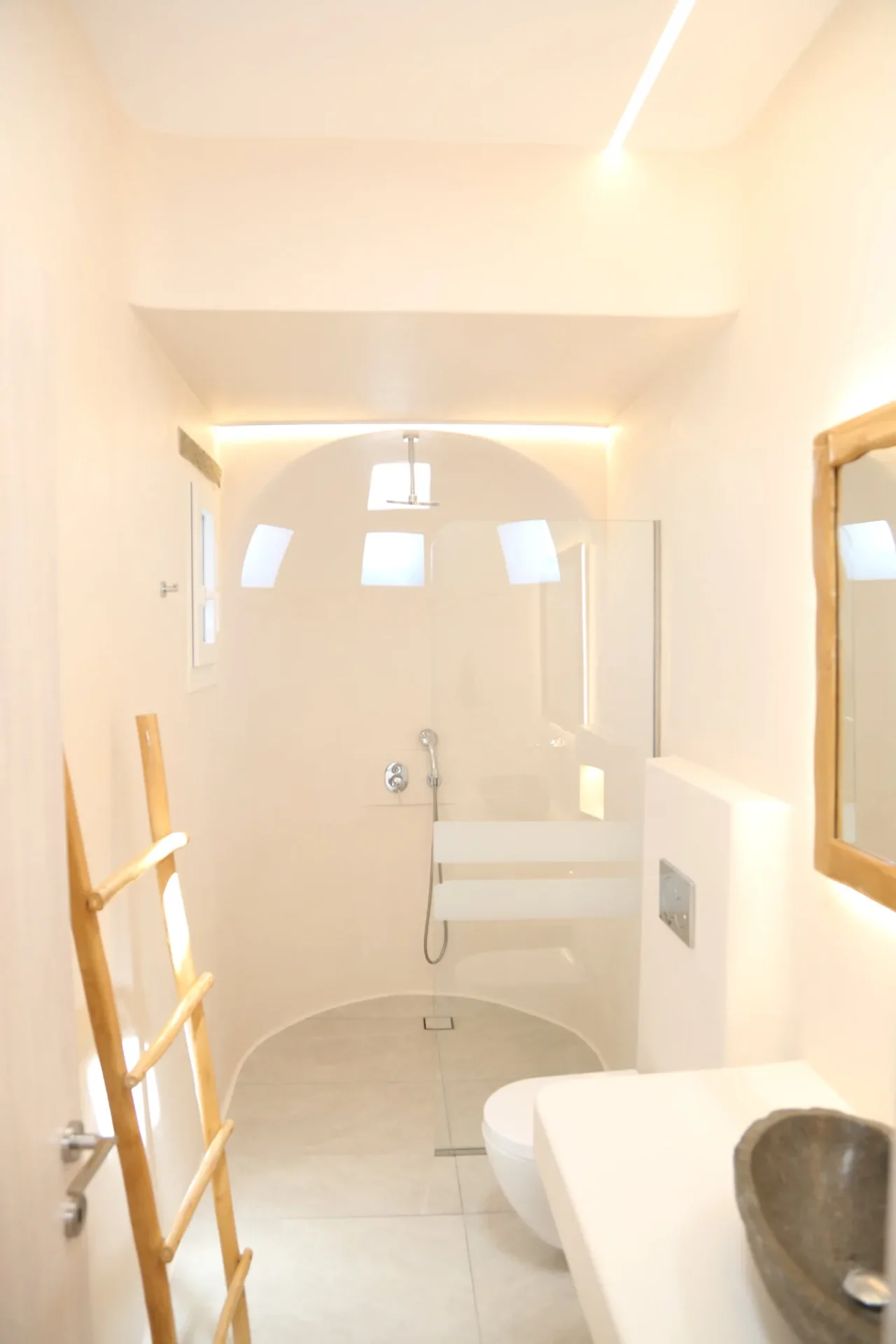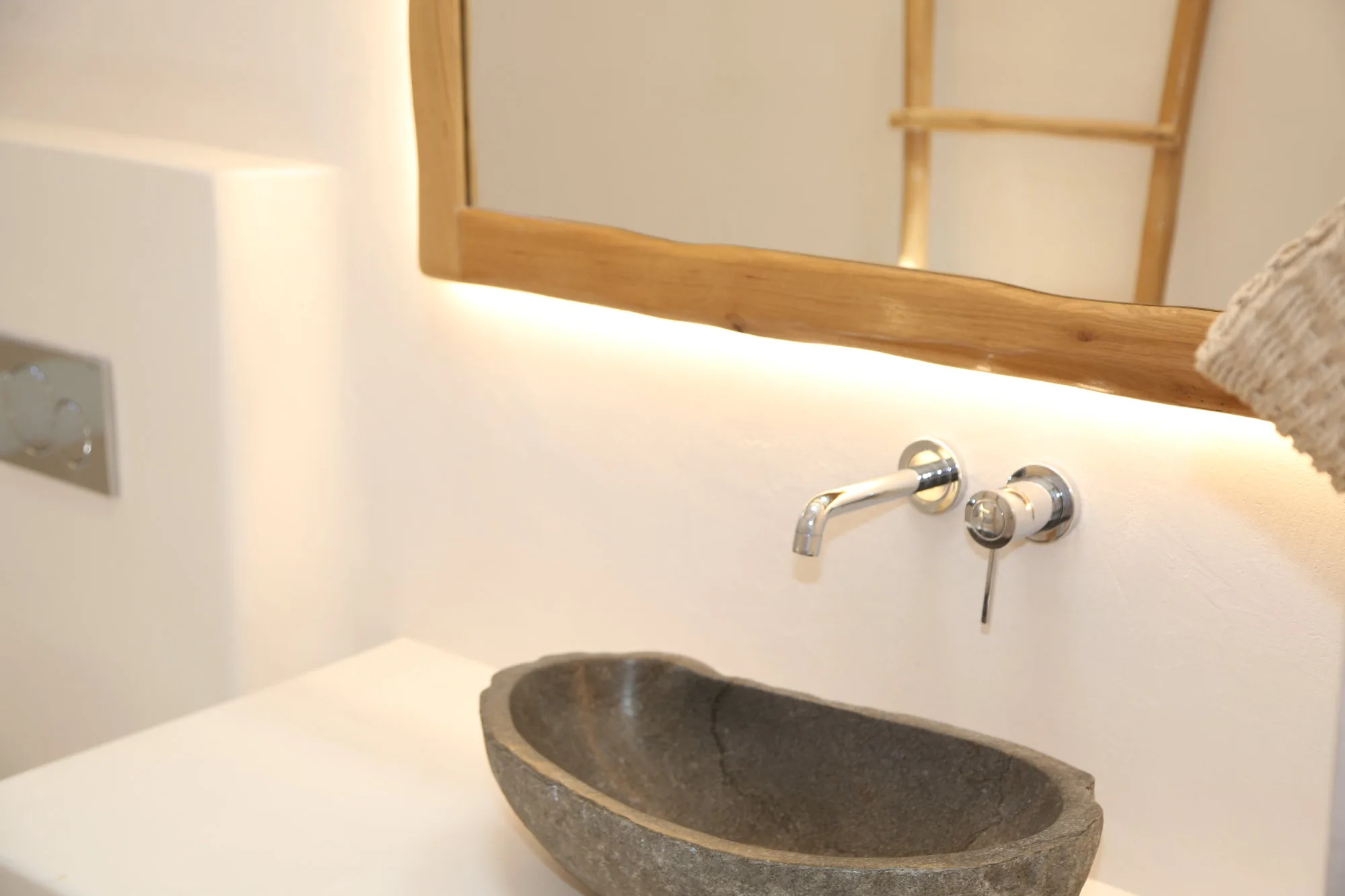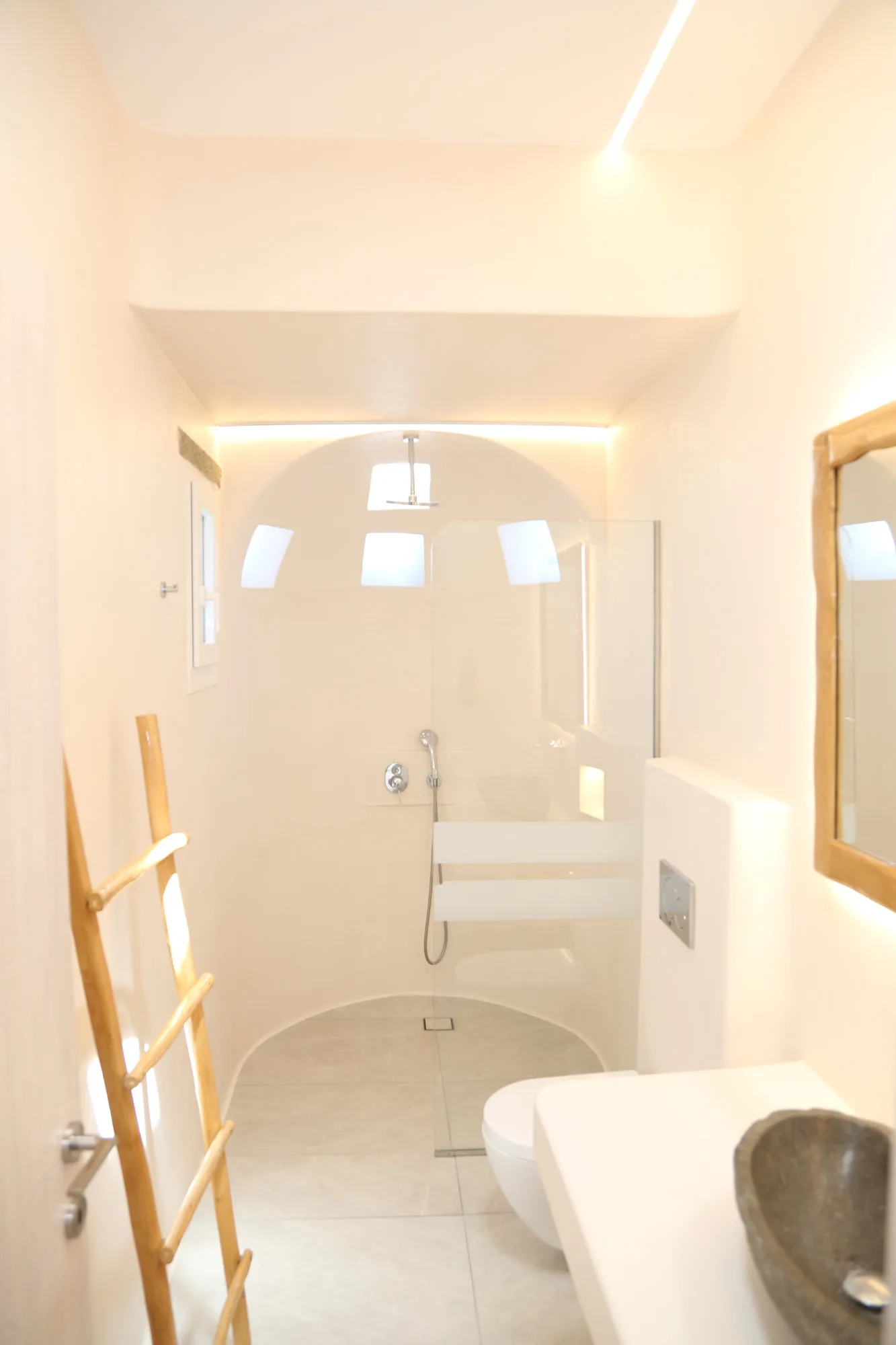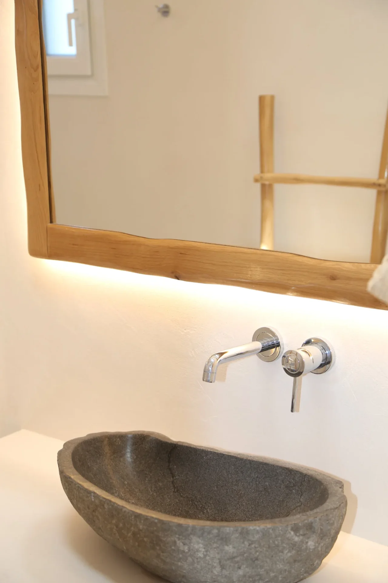 This suite takes accommodation to another dimension. The 40 sq.m open‑plan space features a private balcony and a spectacular rounded traditional bathroom, where wood and stone blend harmoniously with modern lighting and soft curves, inviting every guest to release stress and drift into a dreamlike state. Hidden lighting creates a playful dance between shadows and light, enhancing the suite’s serene ambiance.