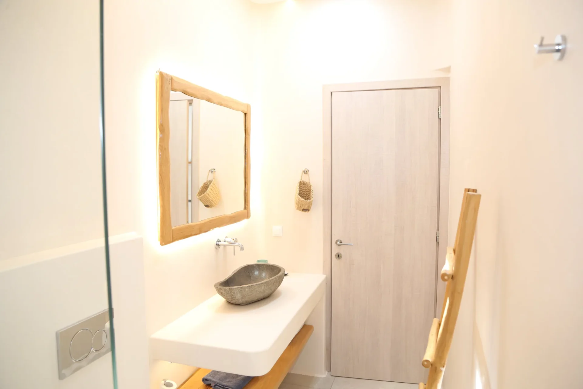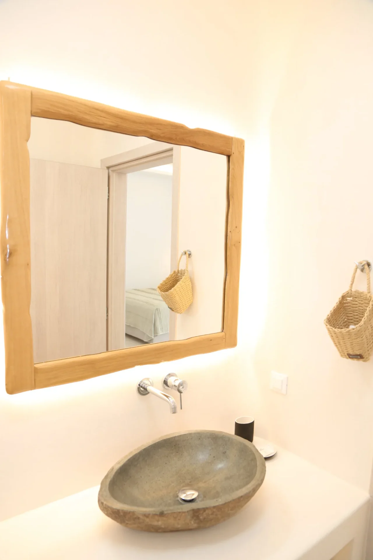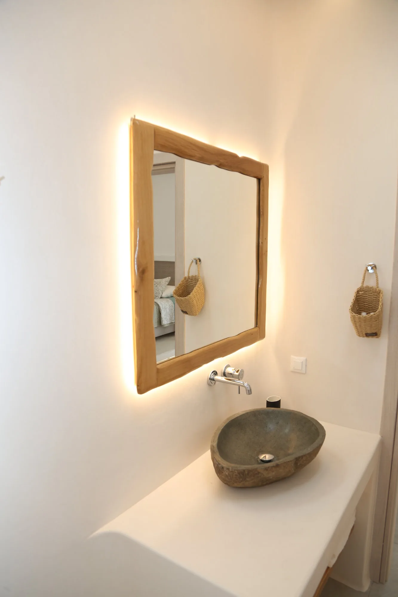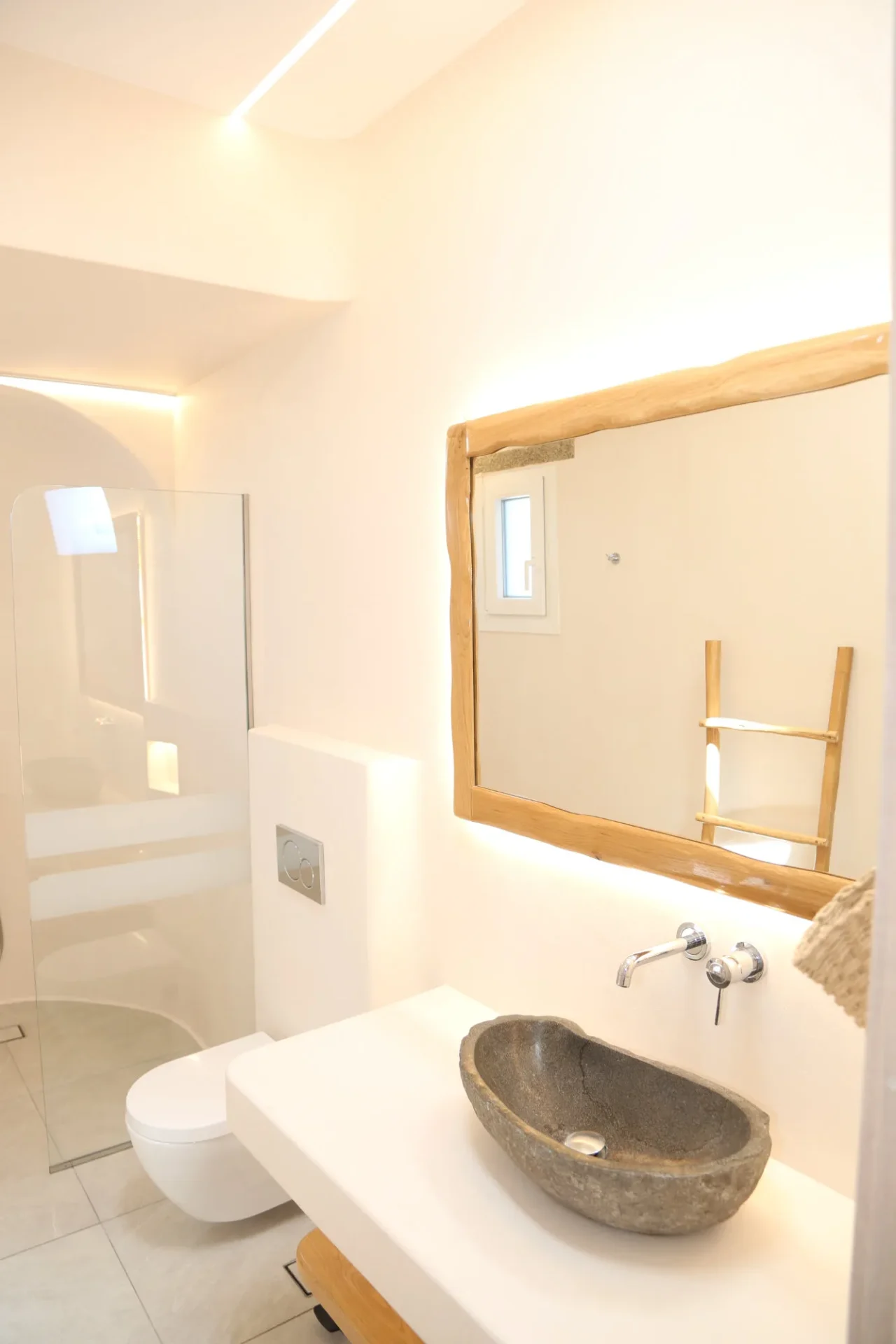 This suite takes accommodation to another dimension. The 40 sq.m open‑plan space features a private balcony and a spectacular rounded traditional bathroom, where wood and stone blend harmoniously with modern lighting and soft curves, inviting every guest to release stress and drift into a dreamlike state. Hidden lighting creates a playful dance between shadows and light, enhancing the suite’s serene ambiance.